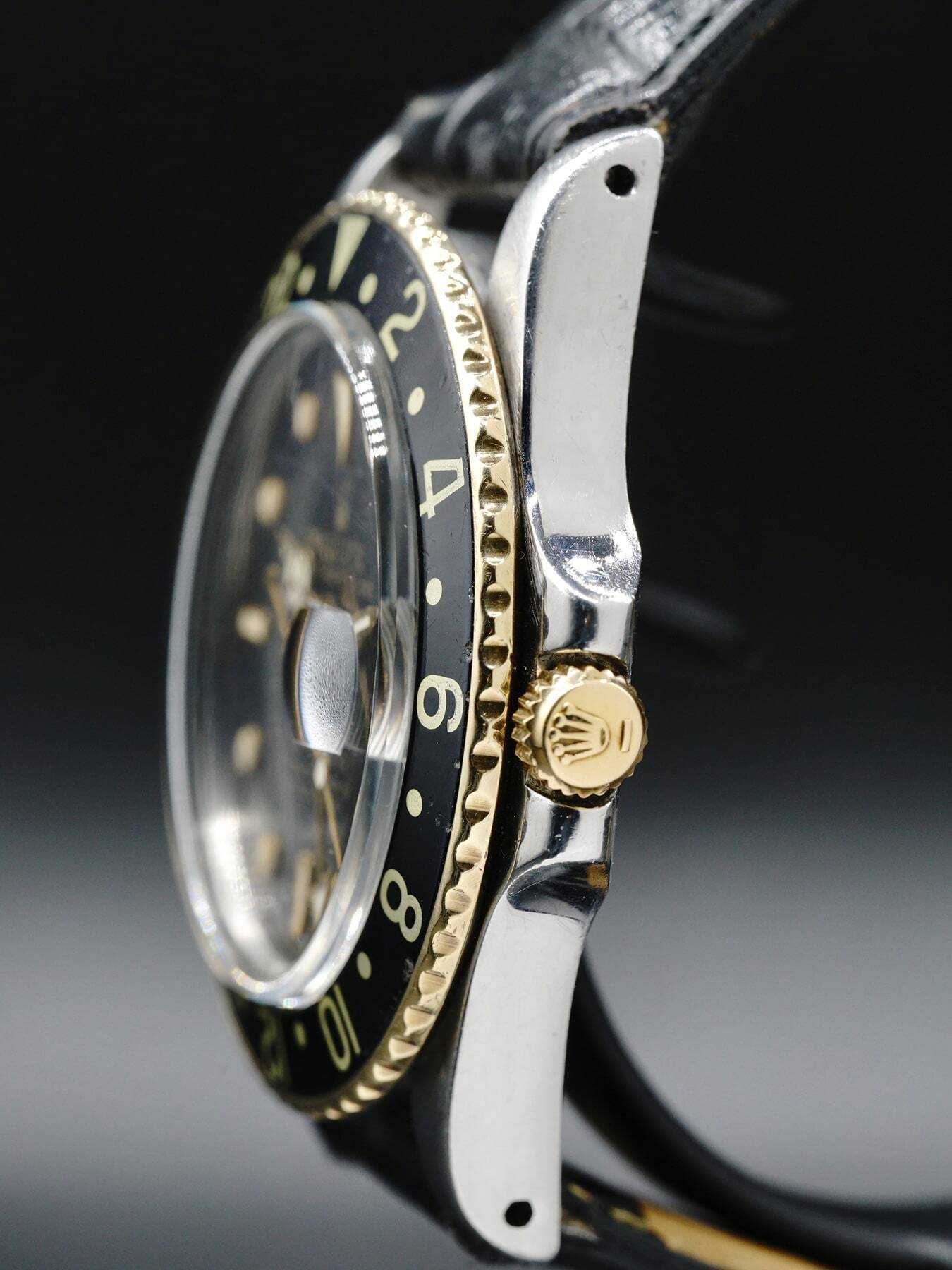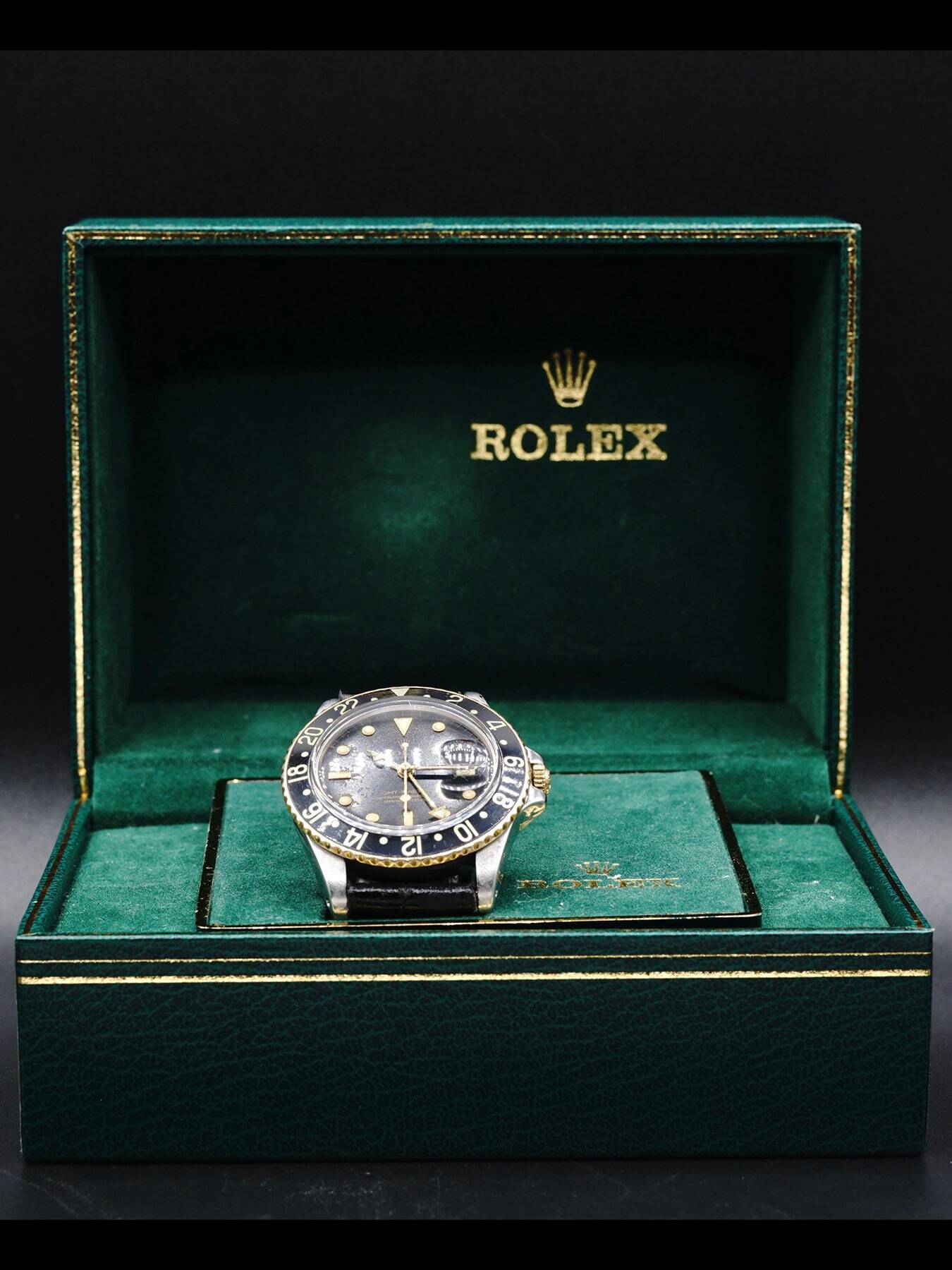 This Rolex GMT-Master 16753 is in VINTAGE condition. This watch includes its original box. Extra black leather strap.