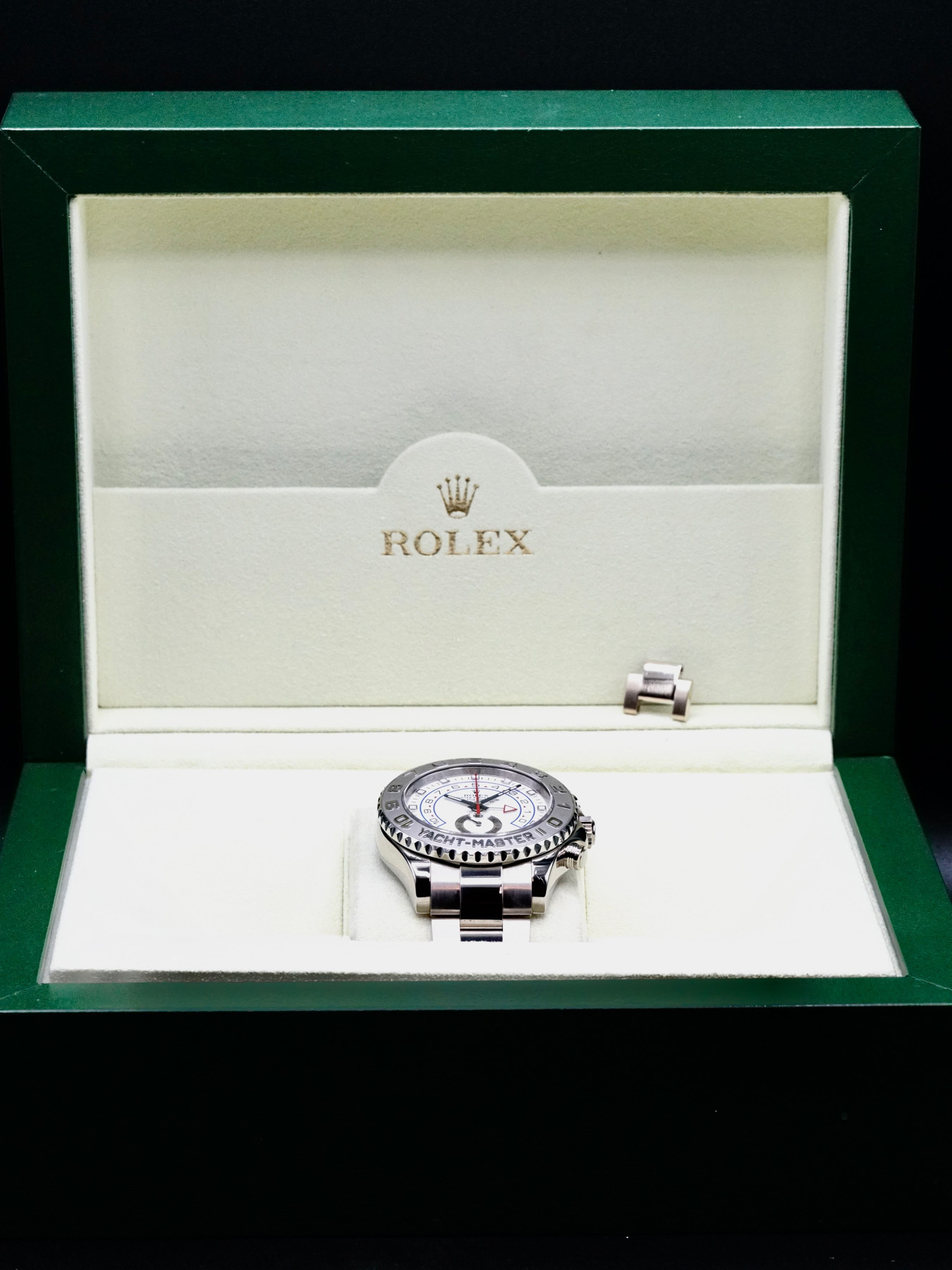 This Rolex Yacht-Master II 116689 is in GREAT condition. This watch includes its original box only. No warranty card. Extra 18k white gold bracelet link. This Rolex watch has been fully authenticated and certified by a 3rd party organization. You’ll receive the certificate of authenticity with your purchase.