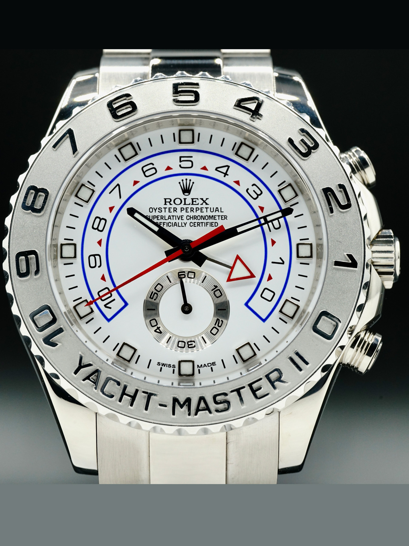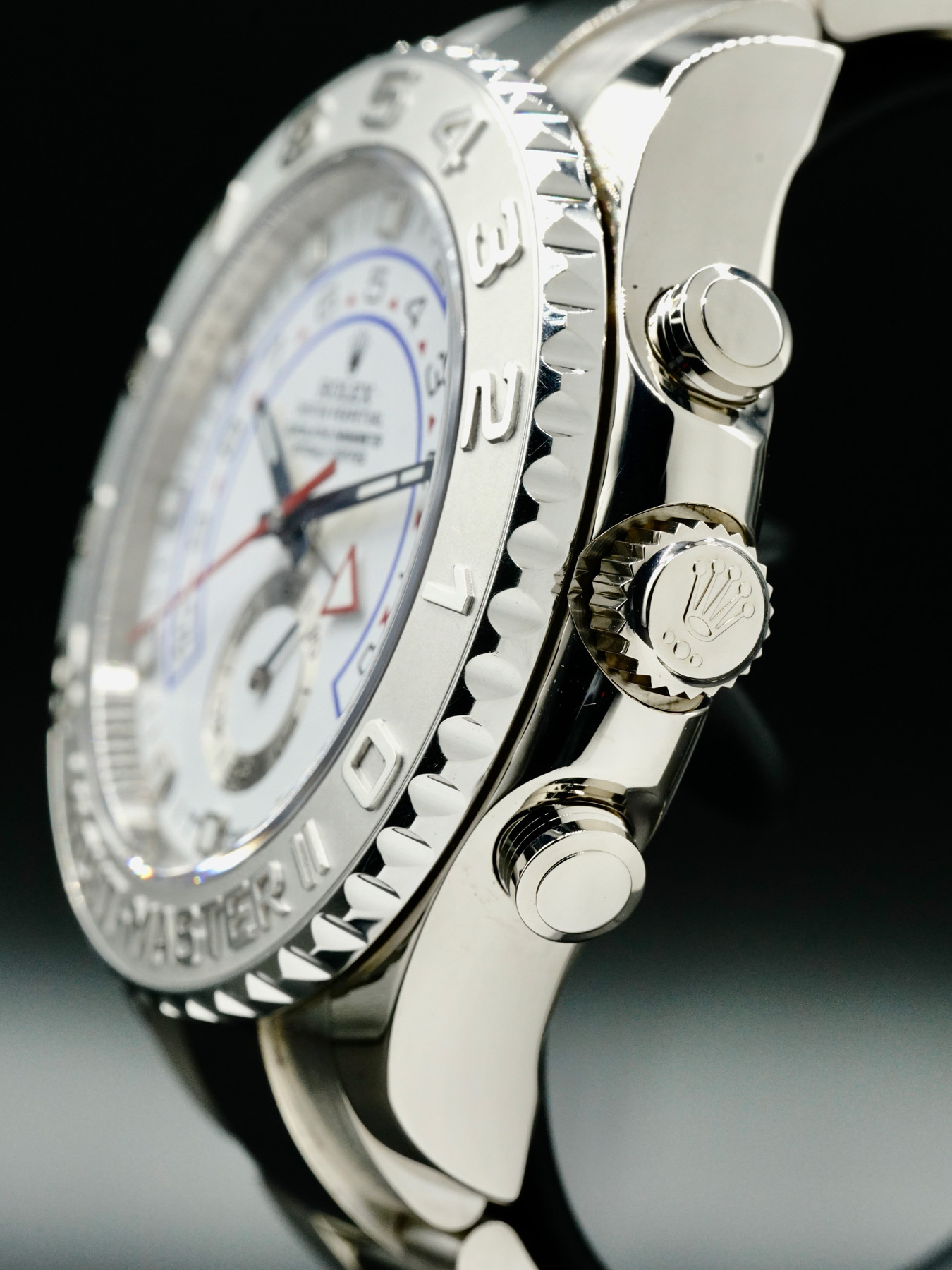 This Rolex Yacht-Master II features a 44mm 18k white gold case with a solid case back on an 18k white gold bracelet. This watch also sports a white dial with luminous hands and index dial markers covered by scratch resistant sapphire crystal.