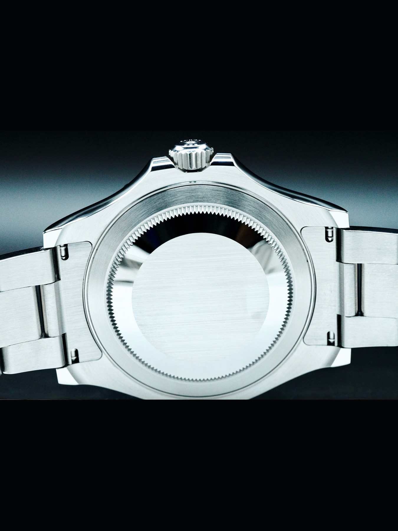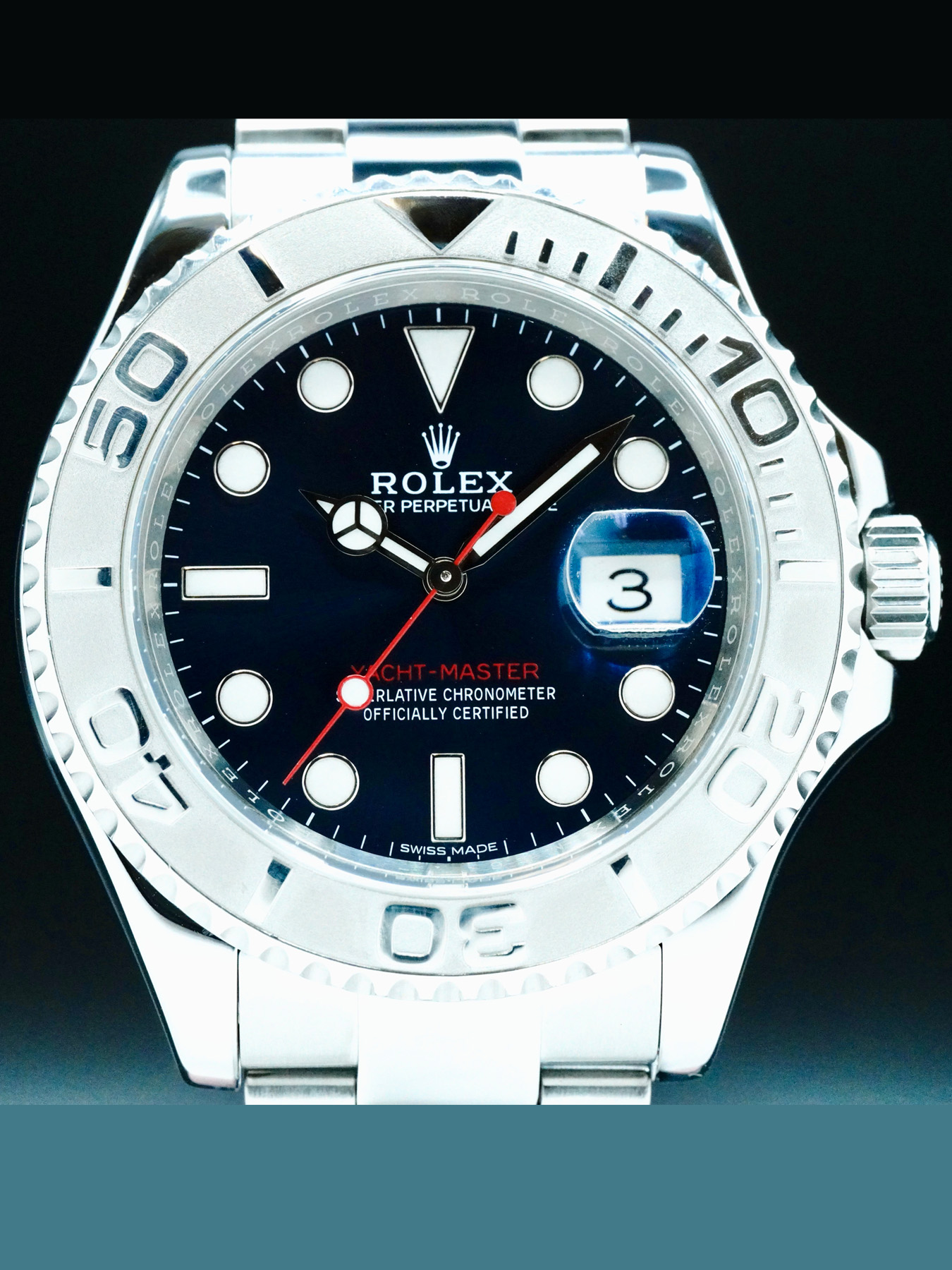 This Yacht-Master features a 40mm stainless steel case with a solid case back on a stainless steel bracelet. This watch also sports a blue sunray dial with luminous hands and index dial markers covered by scratch resistant sapphire crystal.