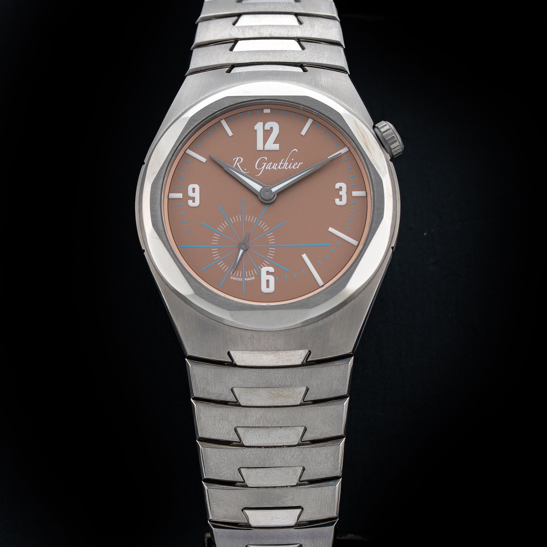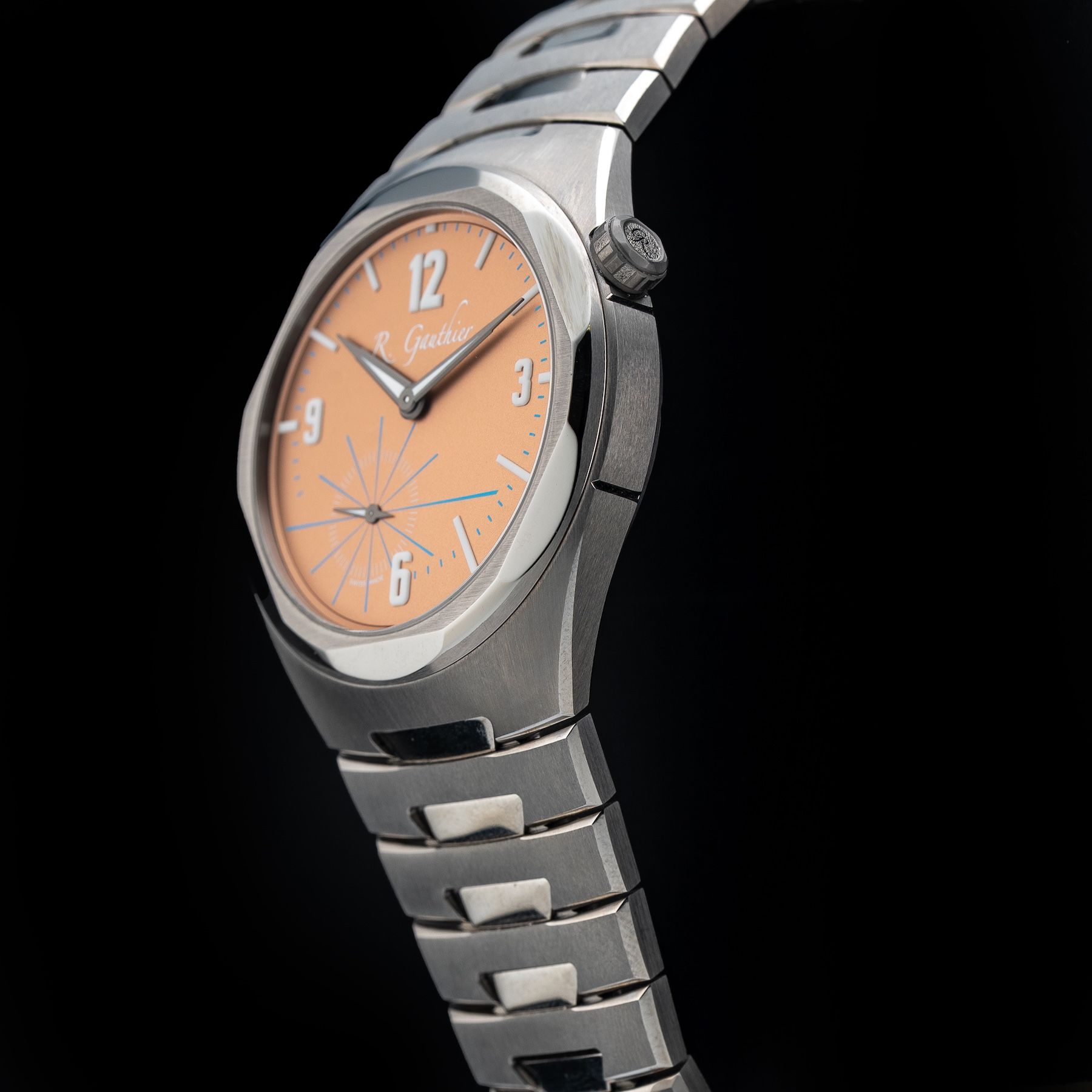 This watch features a 42 titanium case on titanium bracelet. This watch also sports a Lever de Soleil dial. Powered by a manual movement.