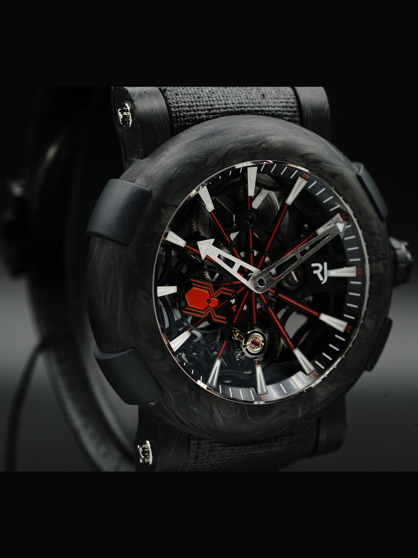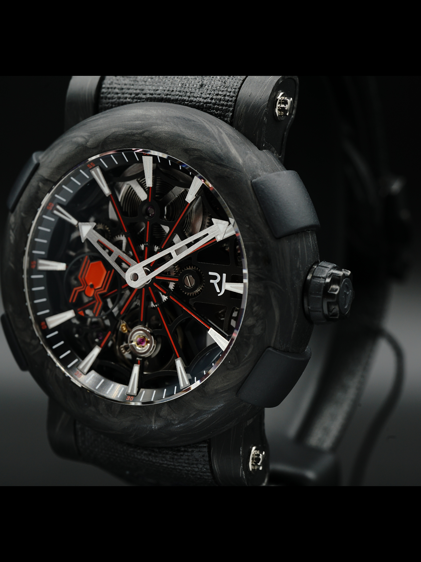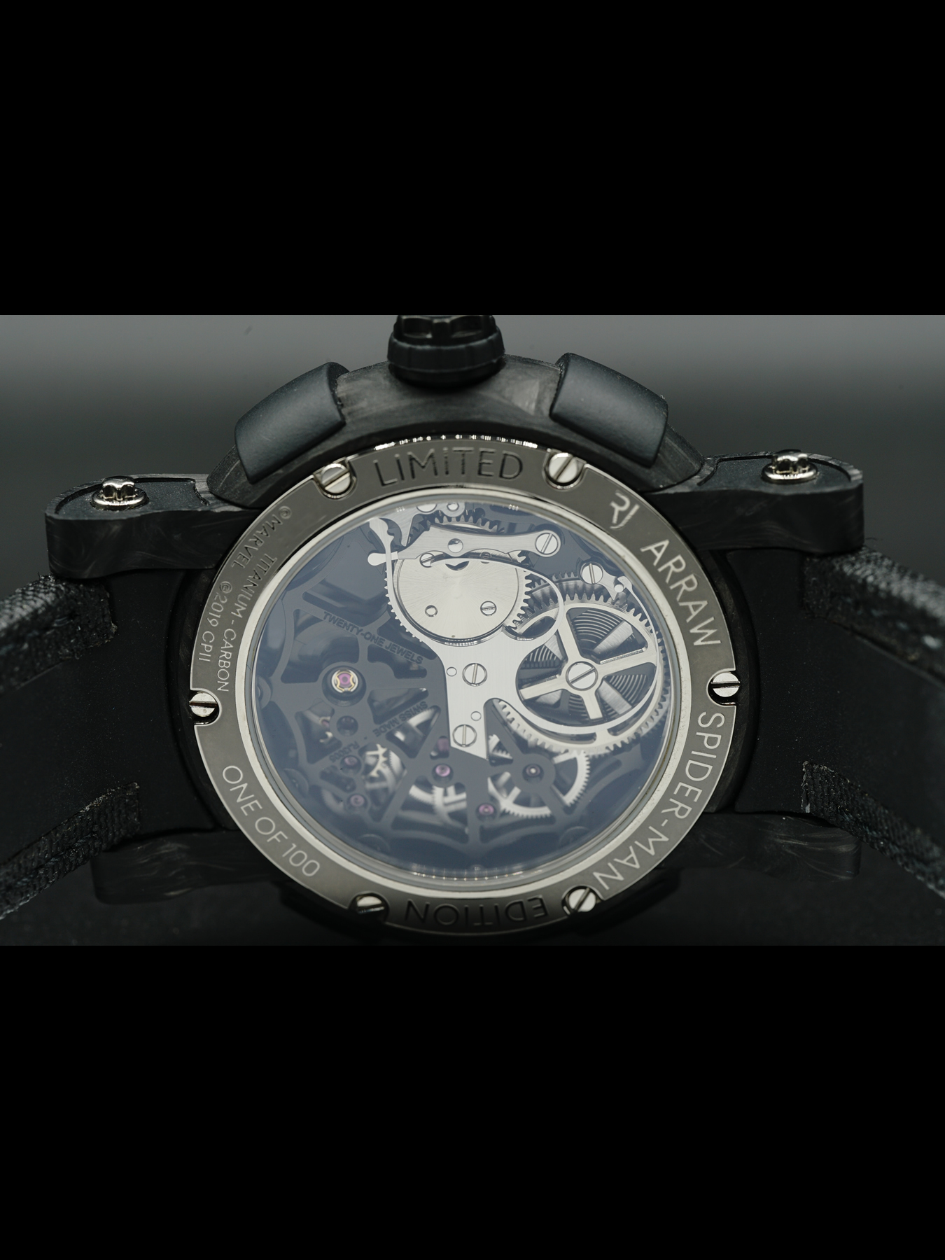 This RJ Arraw Spider-Man is in LIKE NEW condition. This watch includes its original box, ID card, and international warranty. RJ unveils its latest novelty, the ARRAW Spider-Man watch, offering a new perspective of Haute Horlogerie and strengthening its partnership with MARVEL. The ARRAW Spider-Man watch features a skeleton movement manufactured within RJ Studio. Limited to only 100 pieces, its design inspired by the superhero and his characteristics are what makes the watch unique. Spider-Man has inspired us more than just in the exterior of the watch, but also in the integration of his universe directly in the design of the movement.