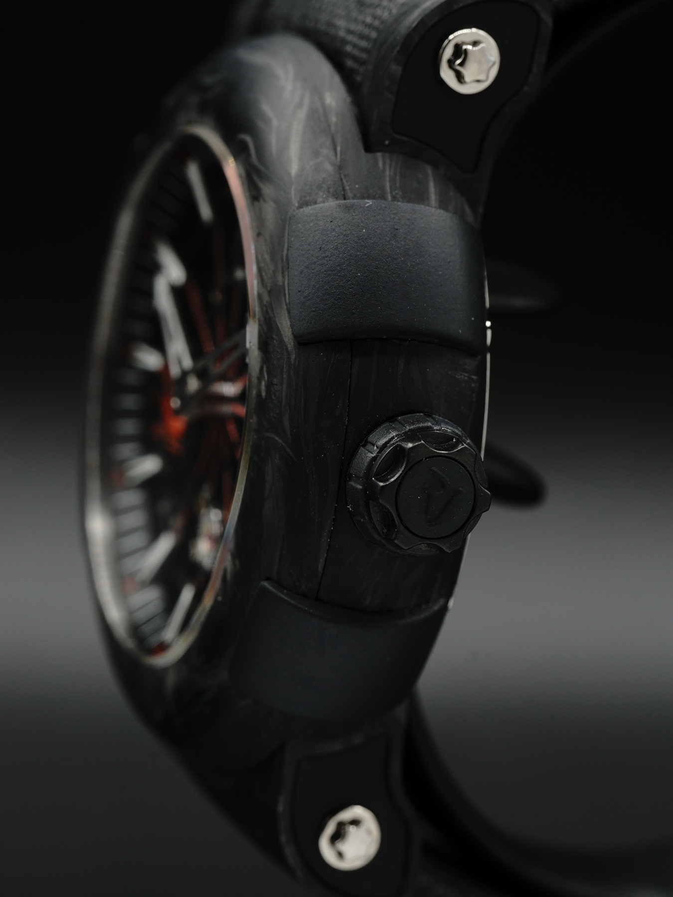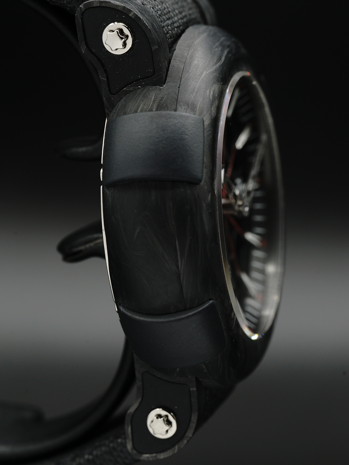 - This timepiece features a 45mm carbon case paired with a high quality leather strap. It showcases a distinctive black dial and is powered by a precise manual winding movement. The watch is designed with a water resistance of up to 100m.
