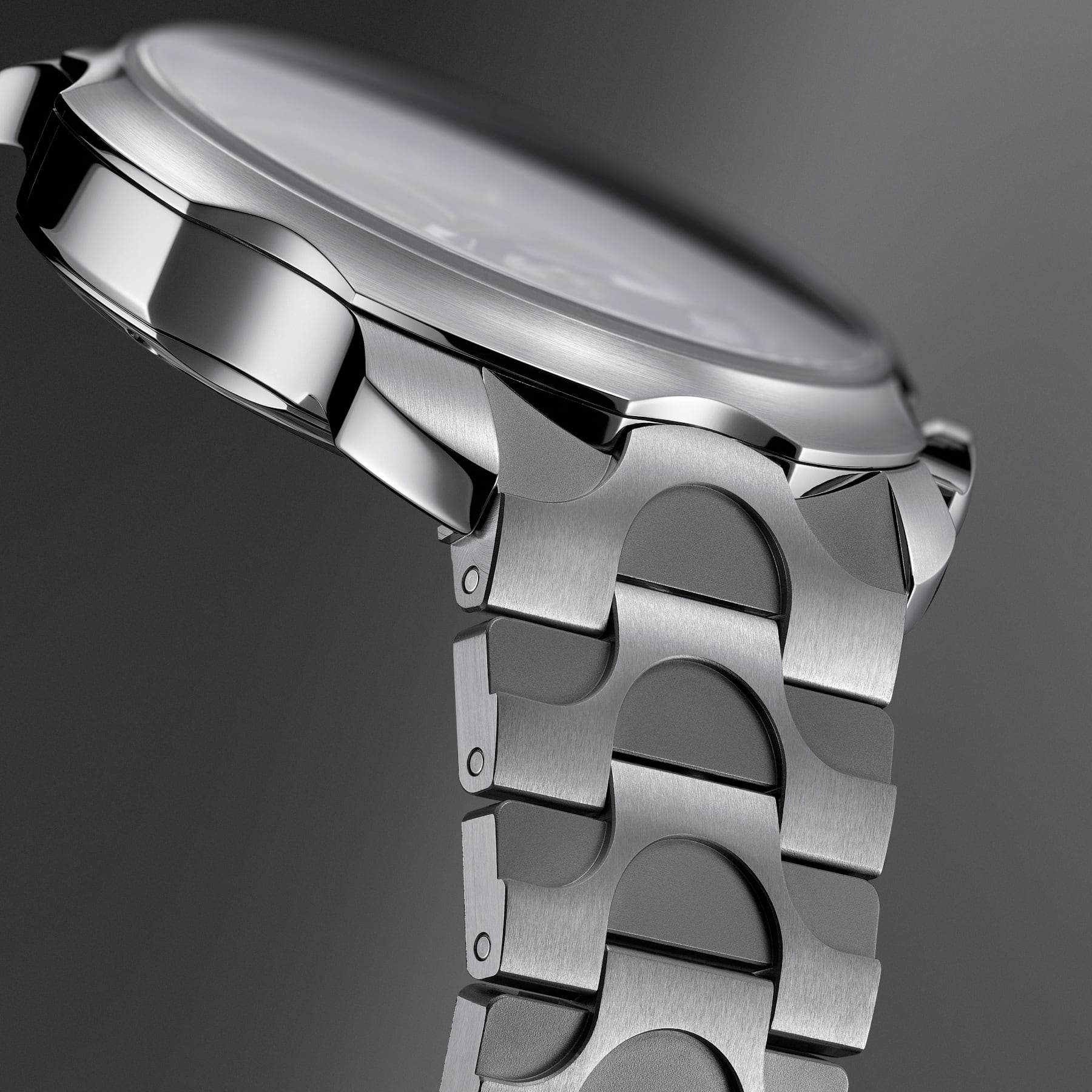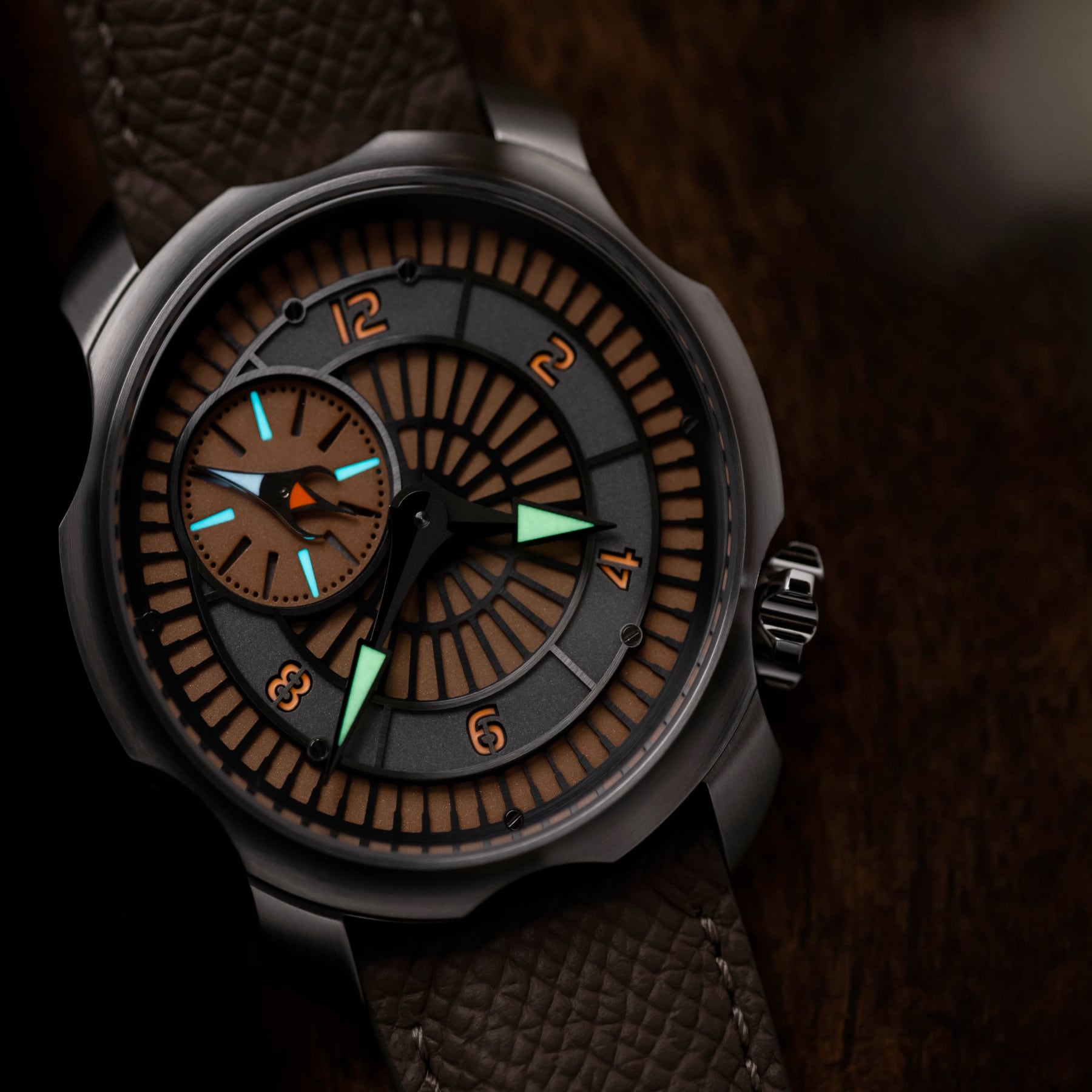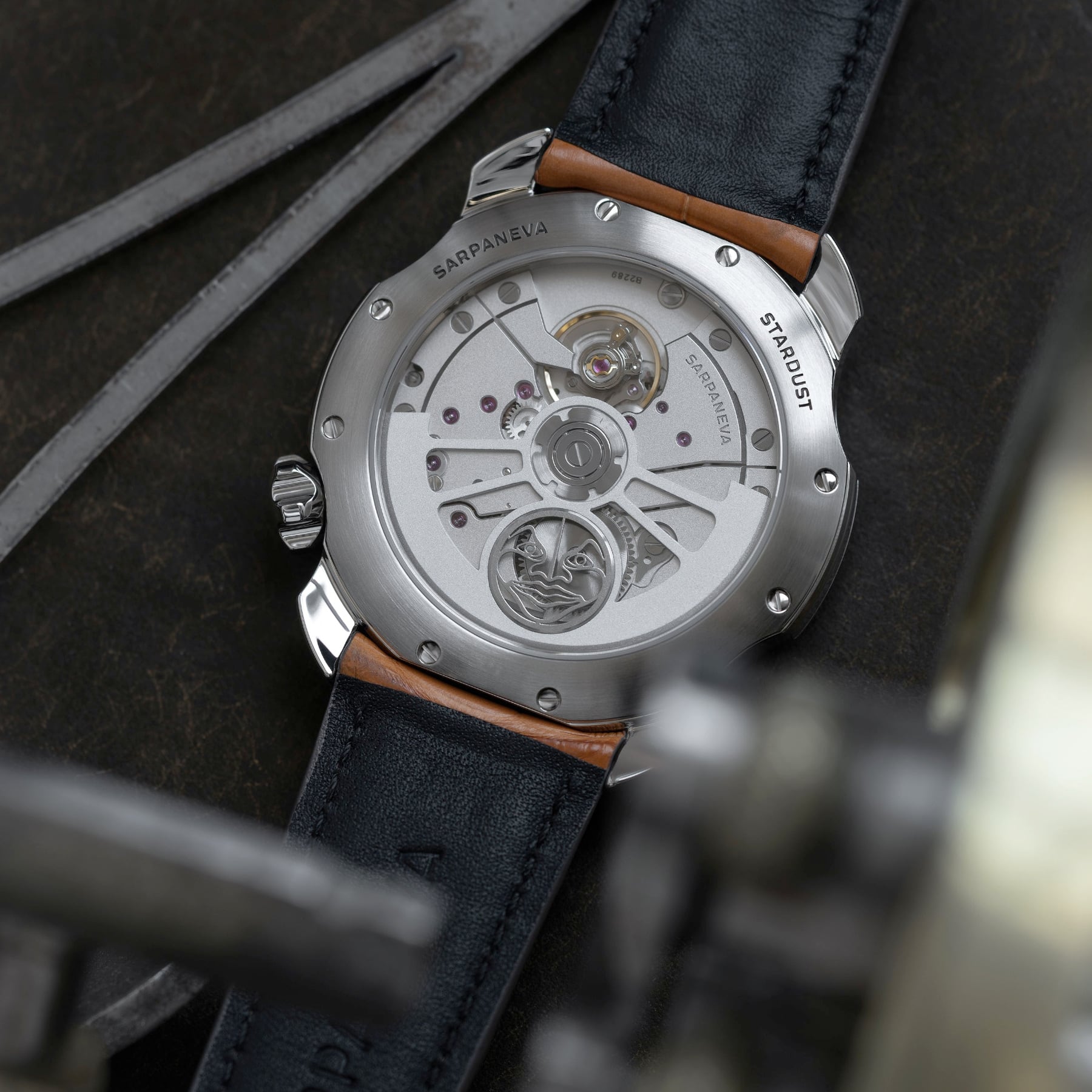 Through the crystal caseback of both Stardust limited editions, the rhodium-plated geometries of Chronode’s ultra-contemporary P.1003 calibre tick surely and steadily. First time switching from center to small seconds. Crucially allowing Stepan to create around the subdial’s spacious, acentric positioning. The Moon is certainly involved, in the bespoke winding rotor. The Sarpaneva ´new moon´ face.