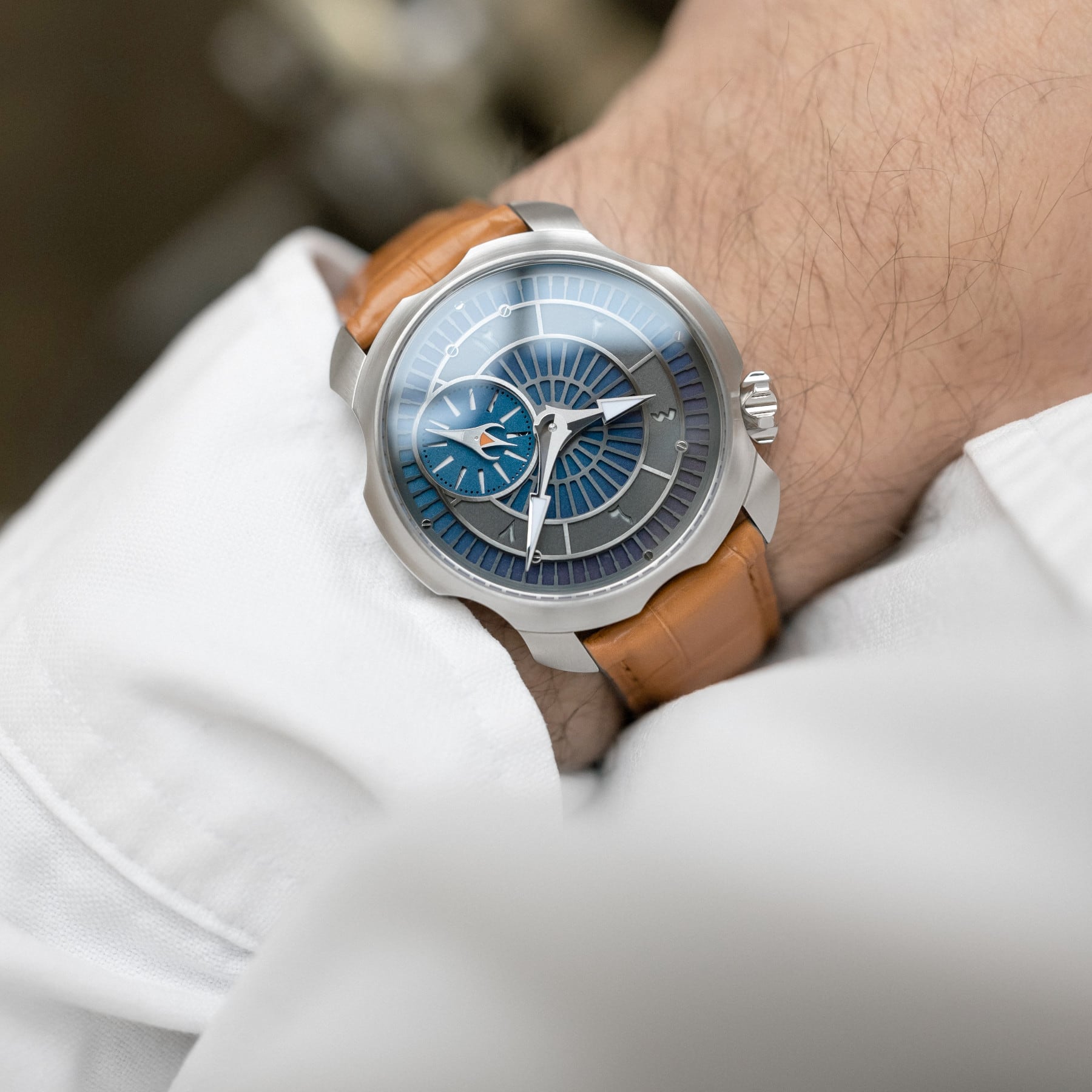 The Sarpaneva Stardust gazes at the night sky with a hand-flamed titanium base dial glowing from beneath; shimmering with colours wrought from different torch temperatures, and echoing the deep-space constellations captured and rendered so vividly by Observatory telescopes - with a dazzling array of hand-applied Tritec luminescence, crafted in-house at Sarpaneva’s workshop.