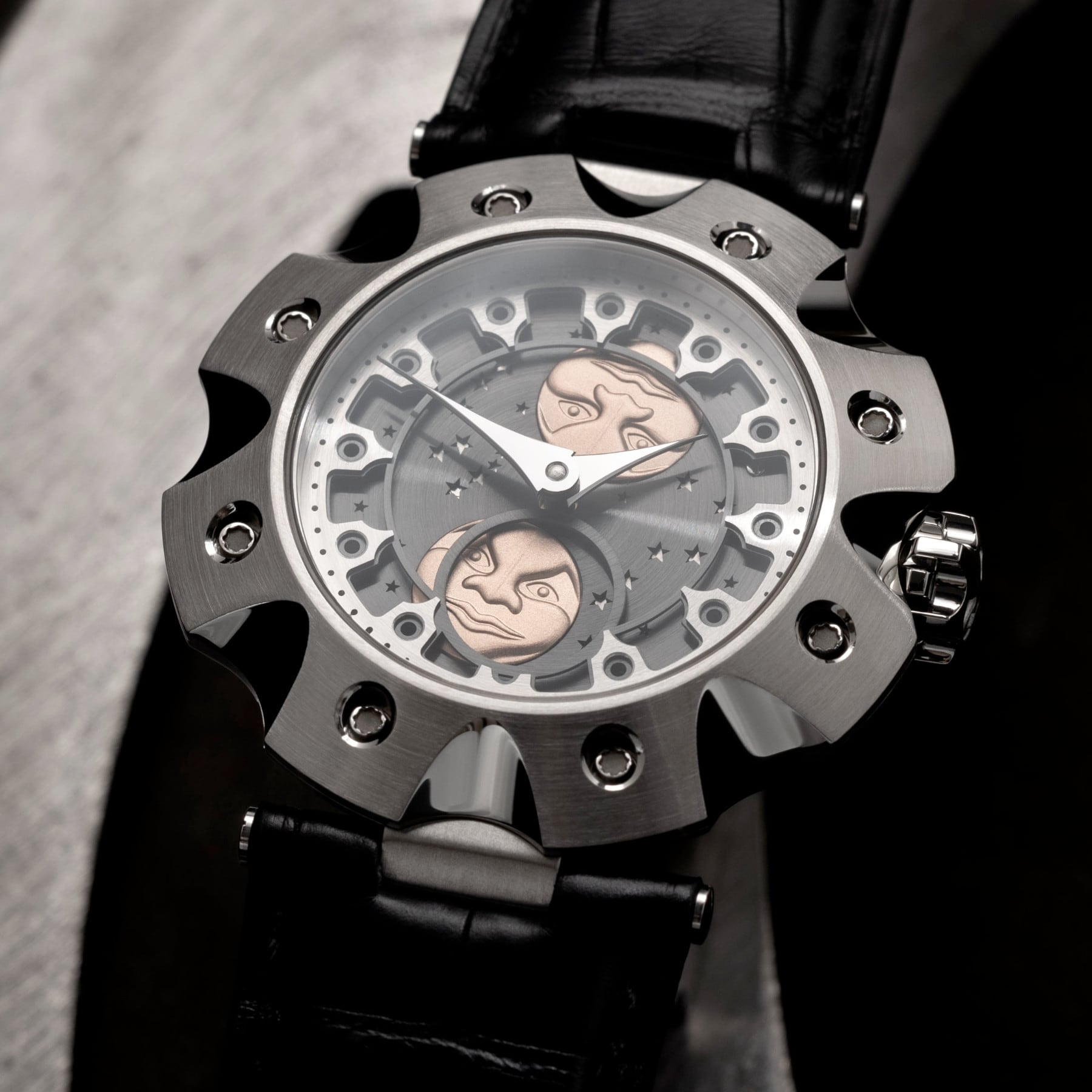 Grey, 5 Part Stainless Steel “Northern Stars“ Dial, Hand Finished, Moonface Relief