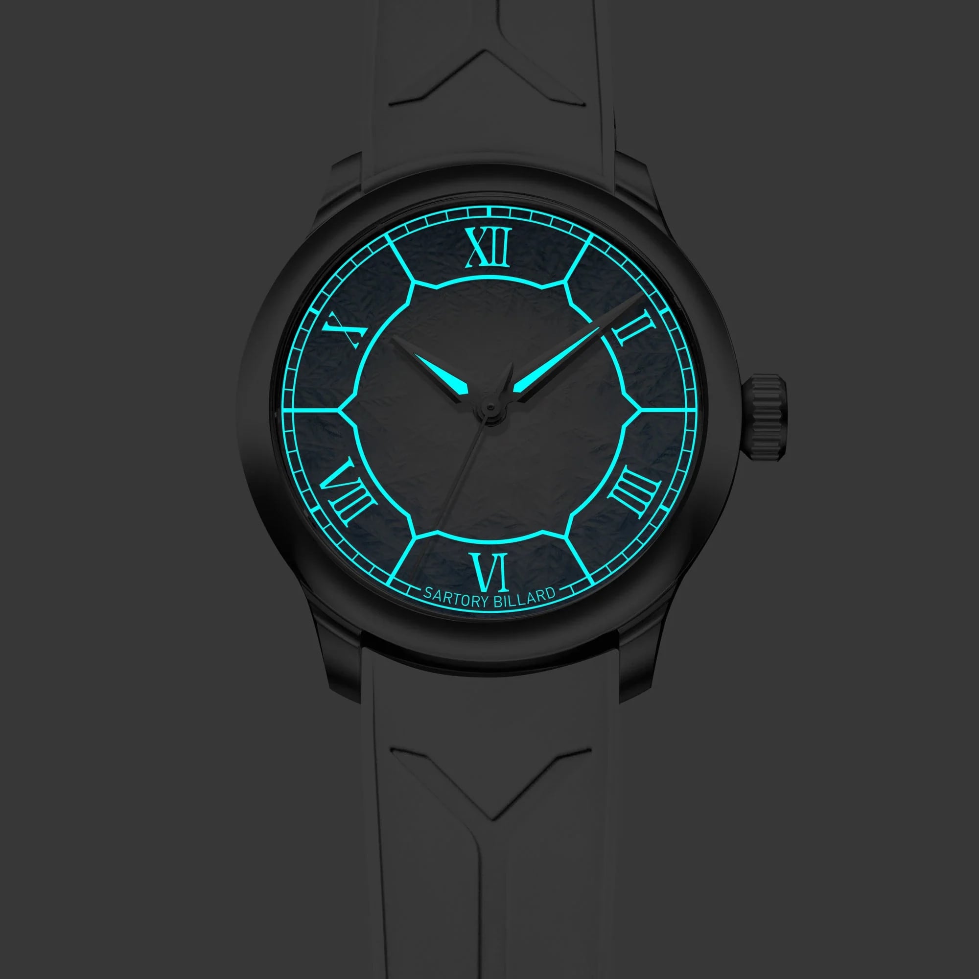 Finally, the Roman numerals are applied by tampography using Super‑LumiNova® BGW9, ensuring legibility in low light while preserving the dial’s calm, monochrome palette.