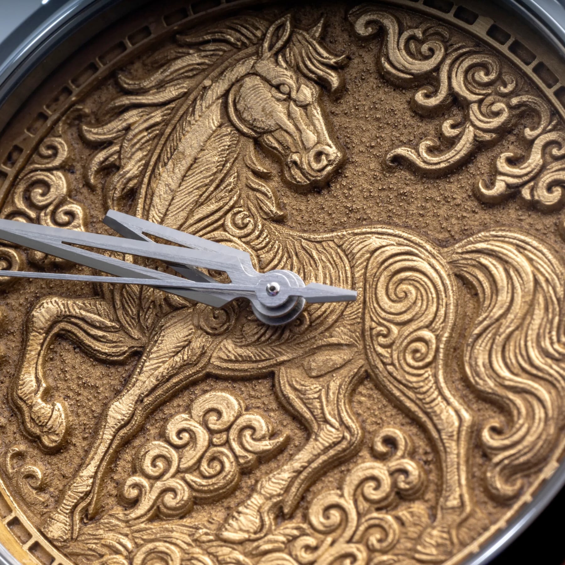 At the heart of the watch lies a 24-carat gold-plated brass dial conceived as a living surface. Based on an original drawing by Armand Billard, the scene is laser-engraved by our partner artist engraver Ron Elkins, revealing a horse caught mid-motion, surrounded by swirling forms that evoke wind, speed, and tension. Light travels across each engraved line, creating depth and contrast while expressing the raw vitality and independence long associated with the horse. The dial does not illustrate the Fire Horse — it channels its force.