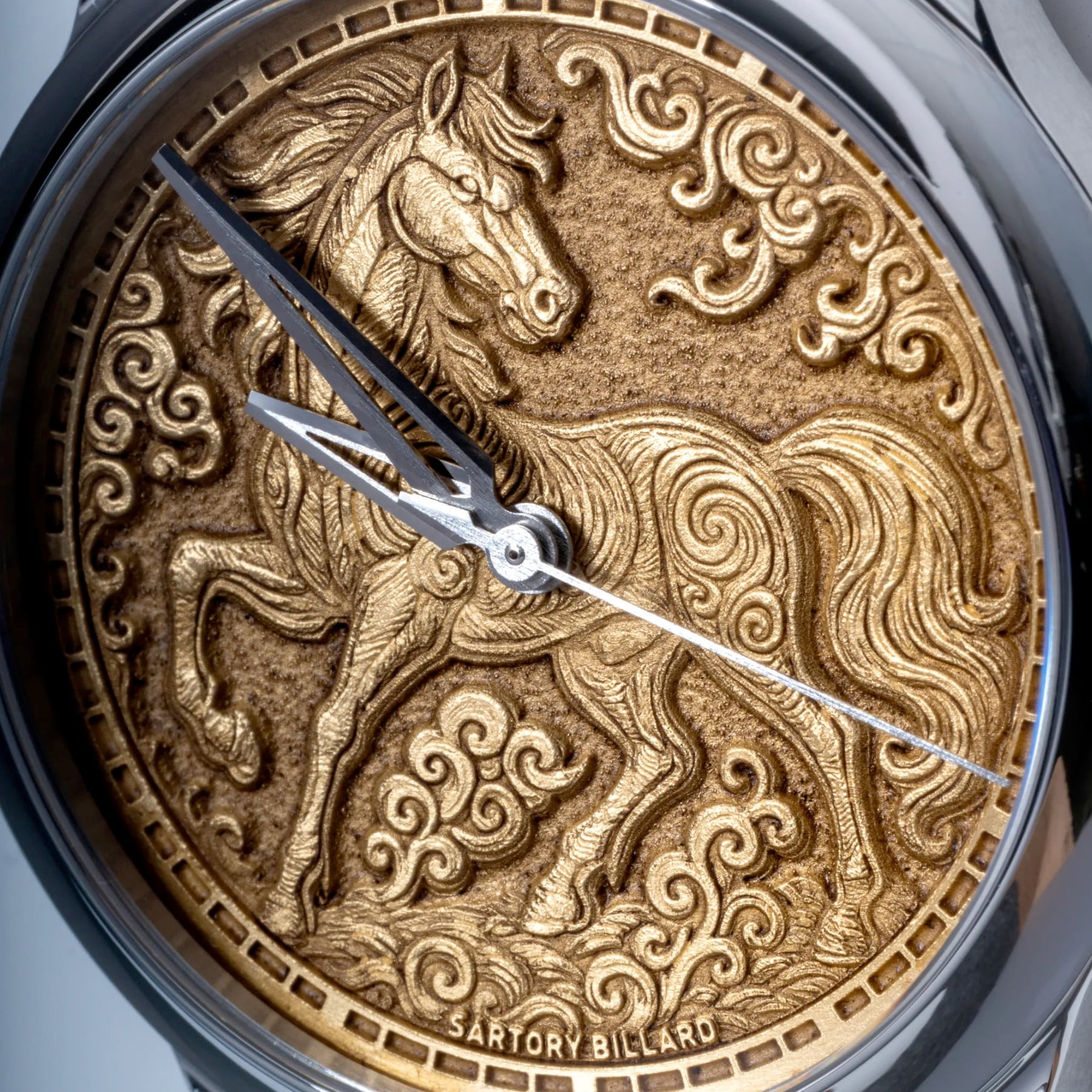 Machined in Switzerland, the dial undergoes multiple transformations before reaching its final form. After engraving in the United States, it returns to Switzerland for thick gold plating, enhancing both contrast and durability. The final Chinese ink highlighting is applied by hand by Armand Billard in France, reinforcing the engraved relief and giving the scene its final intensity.