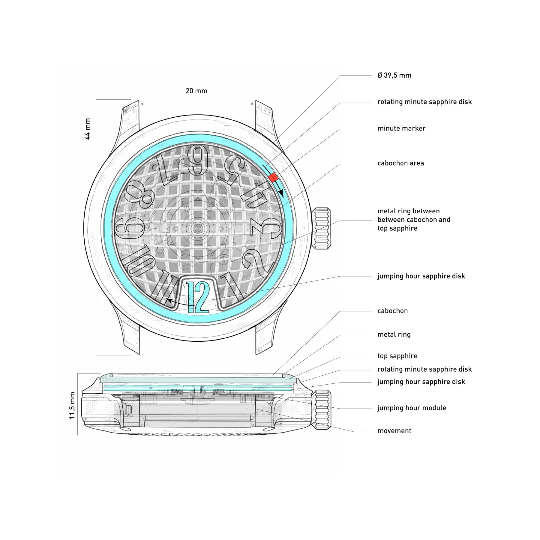 The minutes are indicated by a sapphire disc completing a full rotation every sixty minutes. Around the cabochon, a peripheral ring coated with Super-LumiNova BGW9 traces the passage of time.