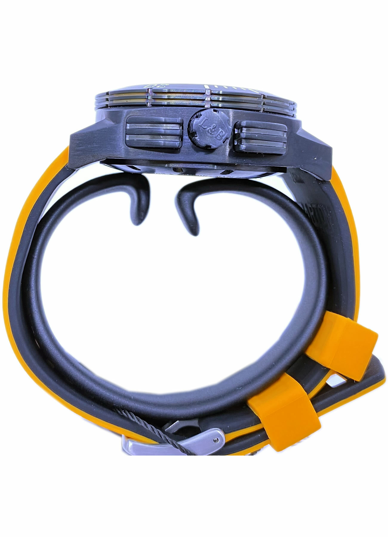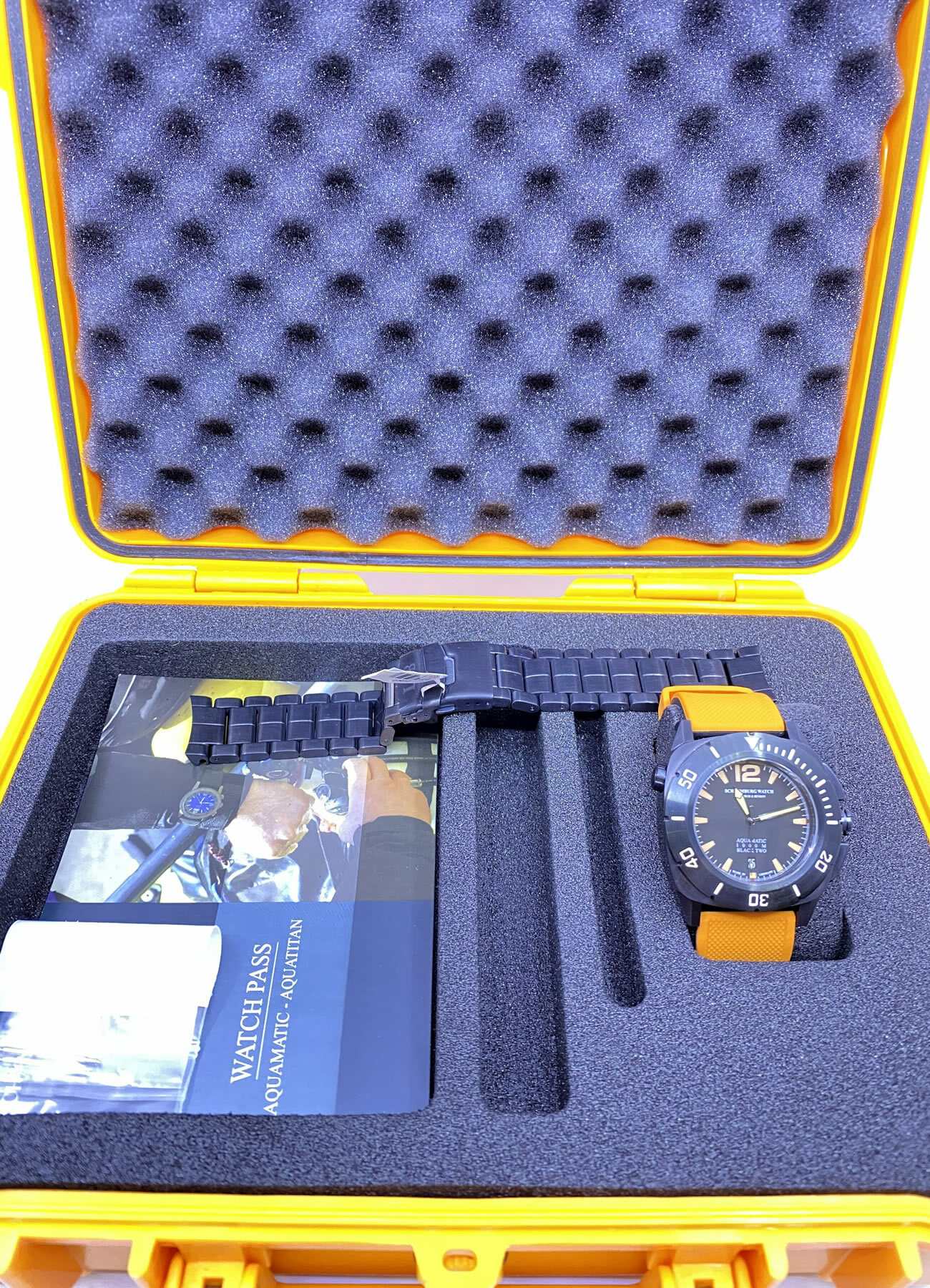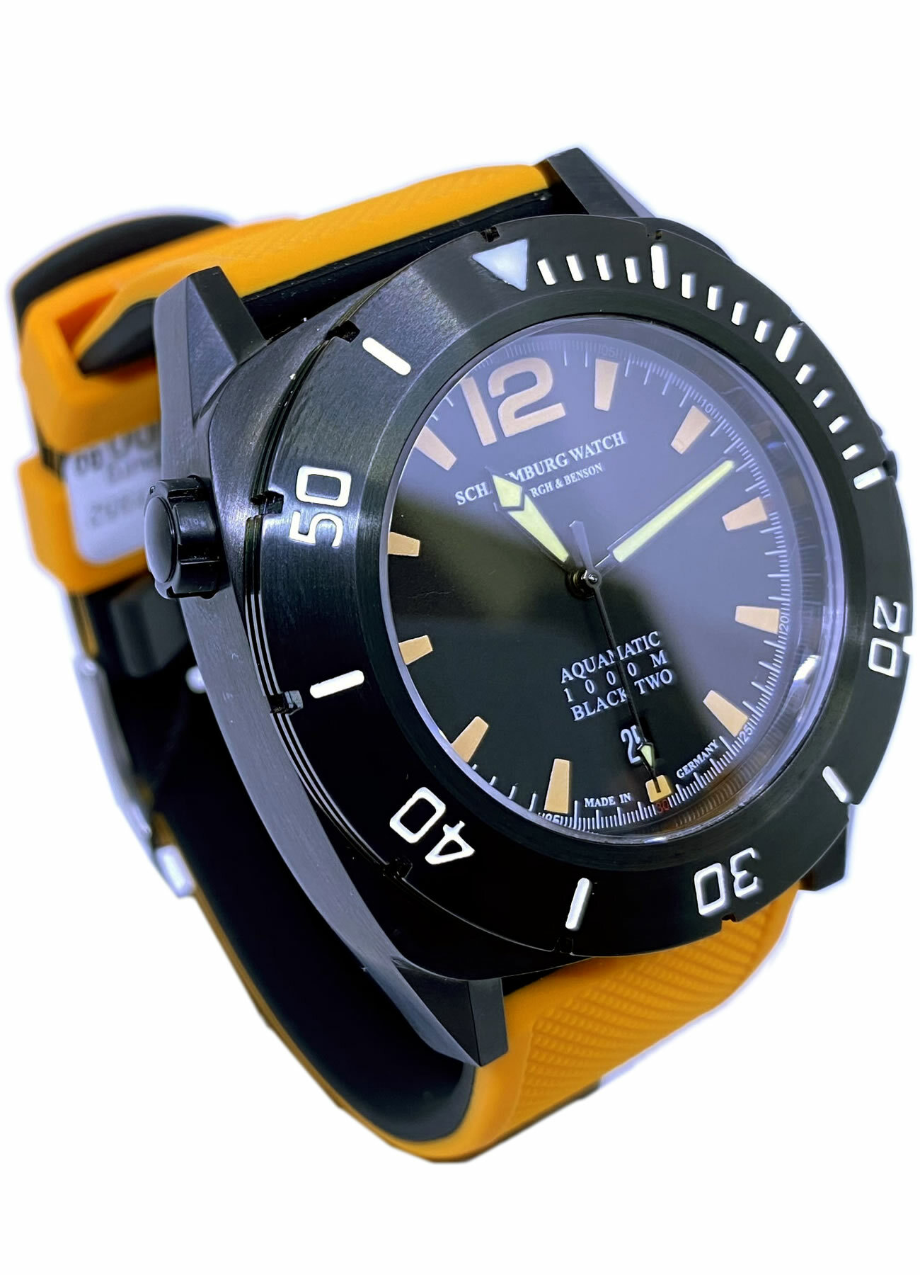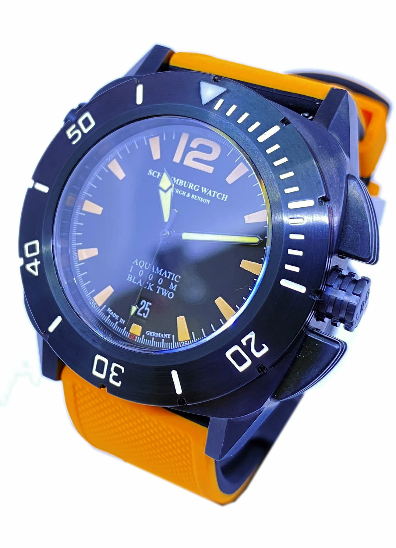 - This timepiece features a 43mm steel case paired with a high quality rubber strap. It showcases a distinctive black dial and is powered by a precise automatic winding movement. The watch is designed with a water resistance of up to 1000m.