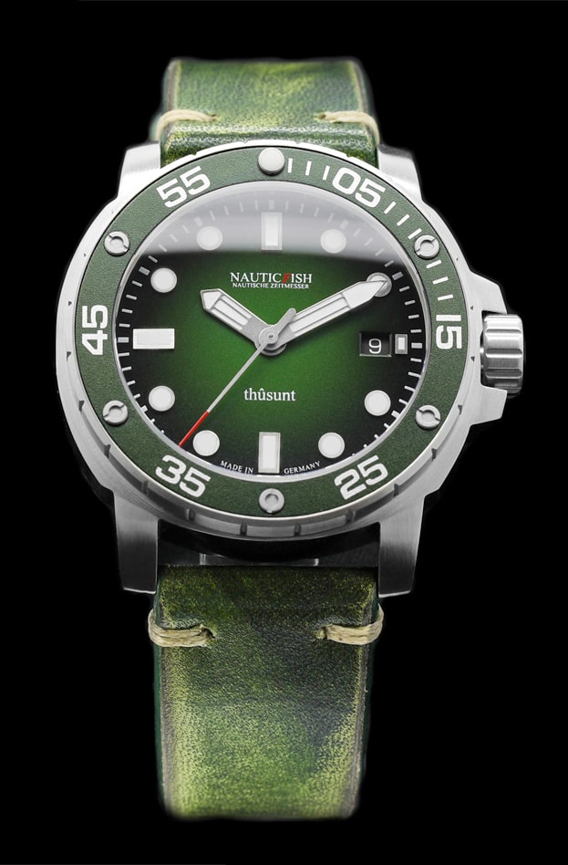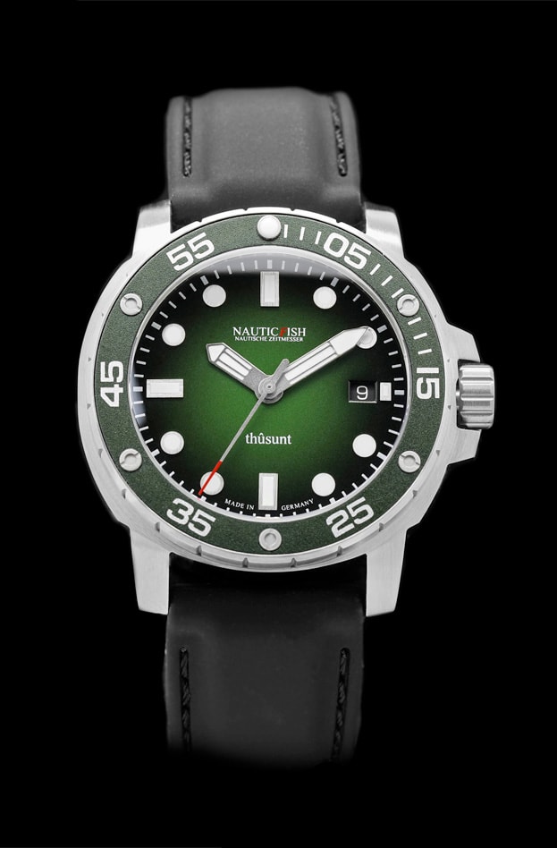 NauticFish Thûsunt - The new generation The Old High German word thûsunt (thousand) stands for the outstanding reliability and water resistance of over 1000 meters of the new NauticFish generation. The goal was to realize a consensus between high reliability, modern functionality and retro-oriented design. The Thûsunt has not been developed for the mainstream market as much more we see the series as a specialty among the diving watches. The dial impresses with its unusual used-style color sequence, the pillow-shaped case with its dimensions of 43x43mm leaves nothing to be desired in the wearing comfort. The excellent readability is ensured by the convex-loupe sapphire glass with an enlargement factor of approx. 1.3. Further technical highlights such as the automatic PVD coated helium valve or the crown seal system perfect the performance of the Thûsunt.