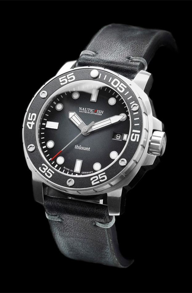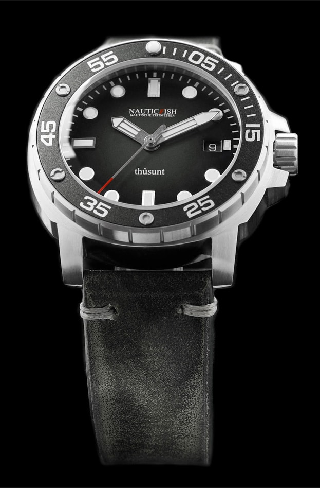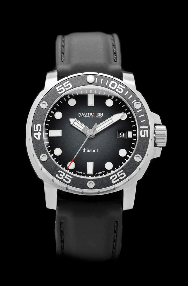 NauticFish Thûsunt - The new generation The Old High German word thûsunt (thousand) stands for the outstanding reliability and water resistance of over 1000 meters of the new NauticFish generation. The goal was to realize a consensus between high reliability, modern functionality and retro-oriented design. The Thûsunt has not been developed for the mainstream market as much more we see the series as a specialty among the diving watches. The dial impresses with its unusual used-style color sequence, the pillow-shaped case with its dimensions of 43x43mm leaves nothing to be desired in the wearing comfort. The excellent readability is ensured by the convex-loupe sapphire glass with an enlargement factor of approx. 1.3. Further technical highlights such as the automatic PVD coated helium valve or the crown seal system perfect the performance of the Thûsunt.
