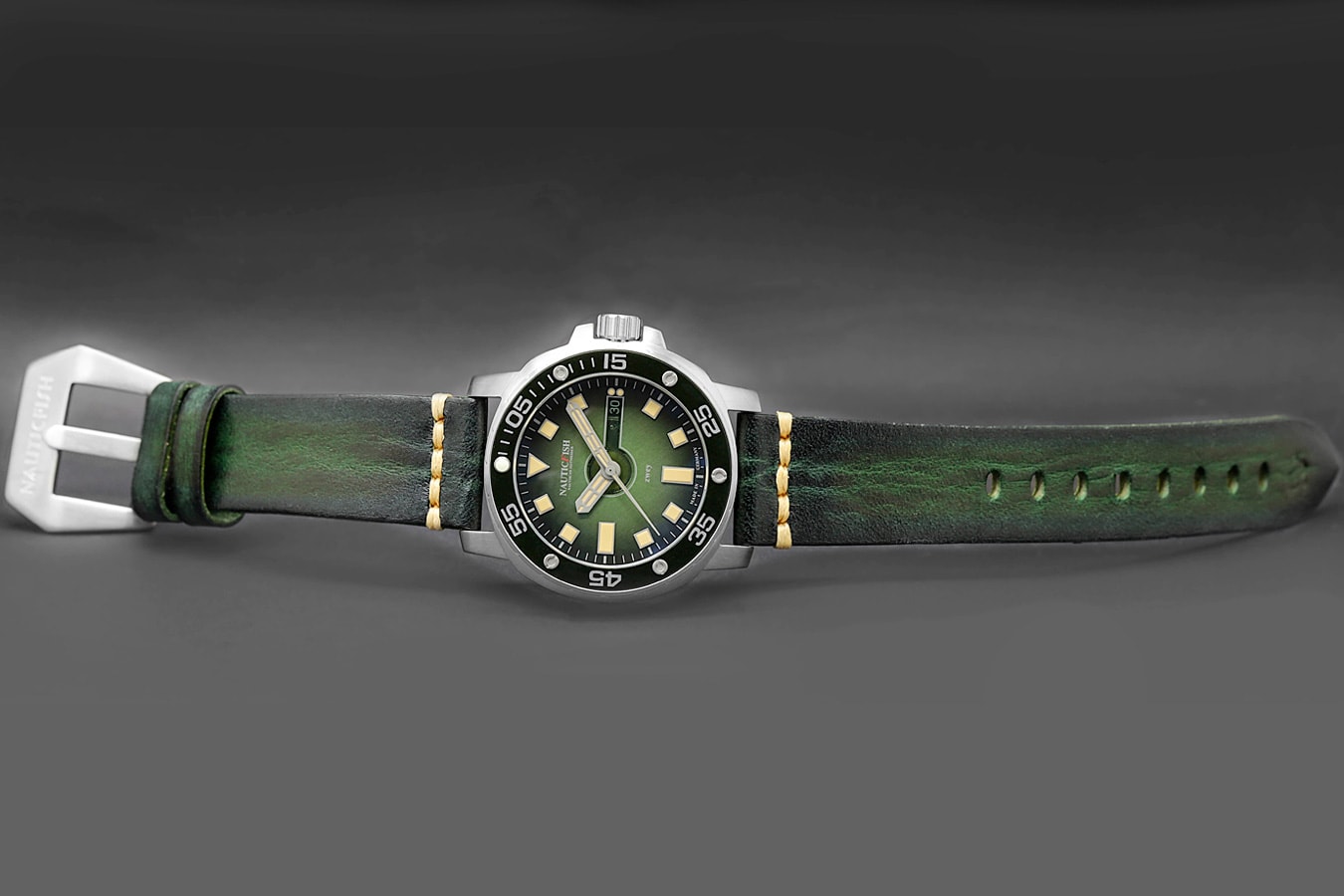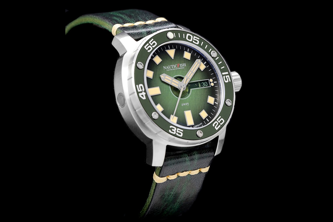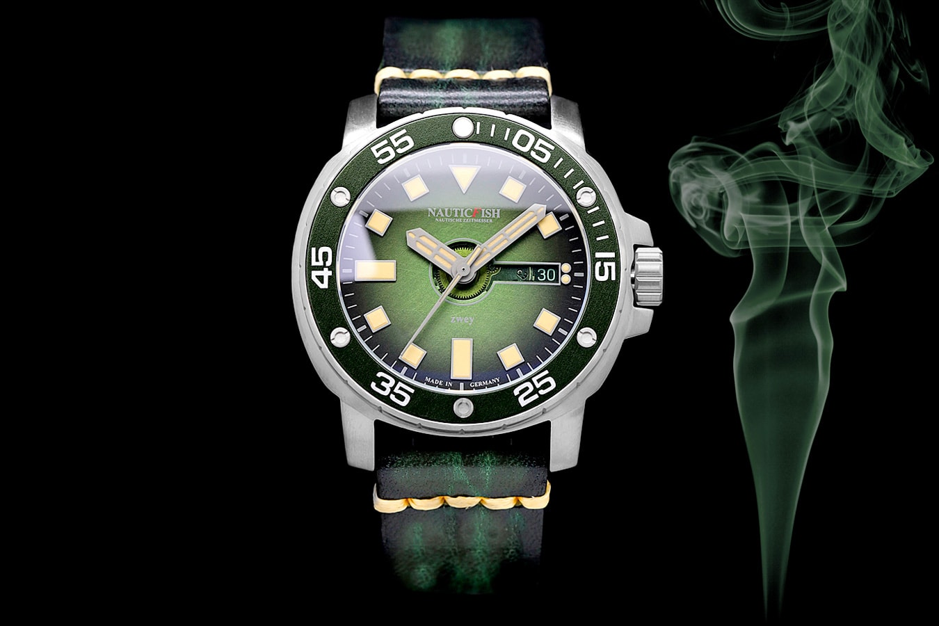 The NauticFish Zwey is a further development and thus the second series of the Thûsunt series. The special feature is the unusual design of the partially transparent dial. Like a view into the sea while diving, it offers a glimpse into the mechanical construction of the movement. The Old High German word thûsunt (thousand) stands for the outstanding reliability and water resistance of over 1000 meters of the new NauticFish generation. The goal was to realize a consensus between high reliability, modern functionality and retro-oriented design. The Thûsunt is not designed for the mainstream market, rather we see the series as a specialty among diving watches. The dial captivates with its unusual color sequence in used look, the cushion-shaped case with the dimensions 43x43mm leaves nothing to be desired in terms of wearing comfort. Excellent readability is ensured by the domed sapphire crystal with a magnification factor of approximately 1.3. Further technical highlights such as the automatic helium valve or the crown sealing system perfect the performance of the Thûsunt.