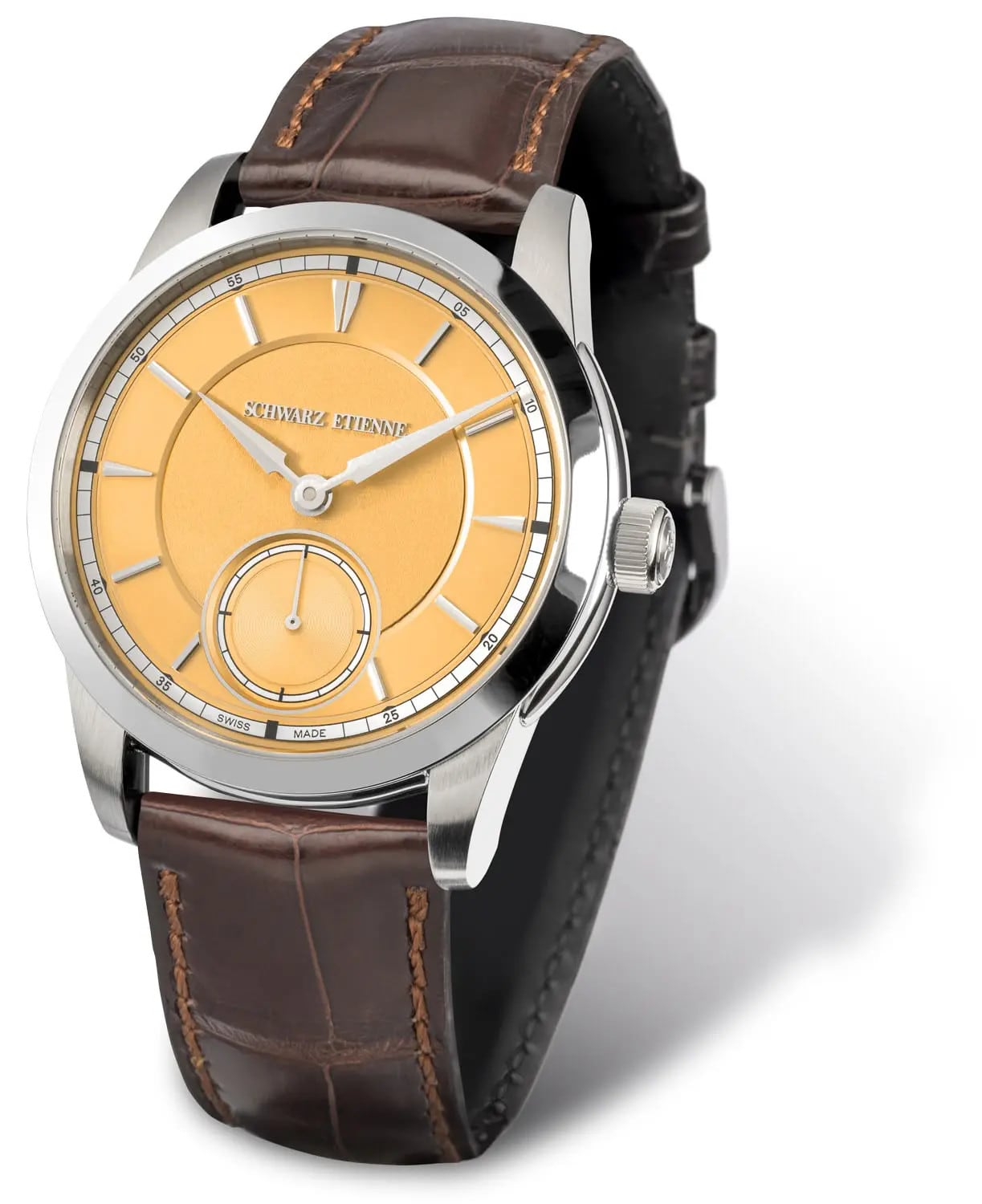 This timepiece features a detailed design with balanced proportions. It includes a well-balanced bezel and an innovative assembly case by Schwarz Etienne. The lugs are crafted to provide both comfort and elegance. The case combines polished and satin-brushed finishes, enhancing the distinctive character of the watch.
