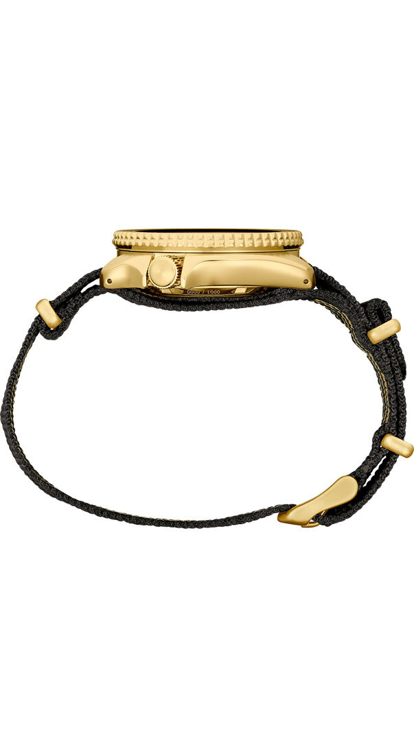 As with the first collaboration model, the dial recreates the fine details of the legendary guitar with a pressed pattern reminiscent of the texture of the wood, its glossy finish and gradated coloring. This case is a special gold-color version, requested by Brian himself, inspired by the newly released 'Gold Series' reissues of his solo albums. The nylon strap is decorated with vertical stripes designed to resemble guitar strings.