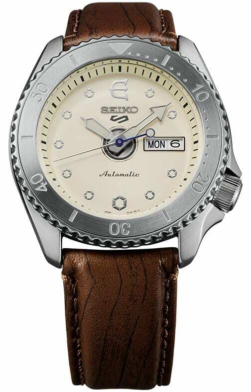 SRPF93 (Caliber 4R36) Limited Edition of 1,500. The off- white dial resembles the urethane material of a skateboard wheel, and the calf belt resembles the wood-grained skateboard deck. The highlight of the design is the dial center, made in the image of a skateboard's bearing. The skateboard's hexagonal indexes are designed in the image of axle nuts that connect the wheels to the truck. On the caseback is the EVISEN logo's iconic Samurai helmet and a serial number from 0001/1500 to 1500/1500.