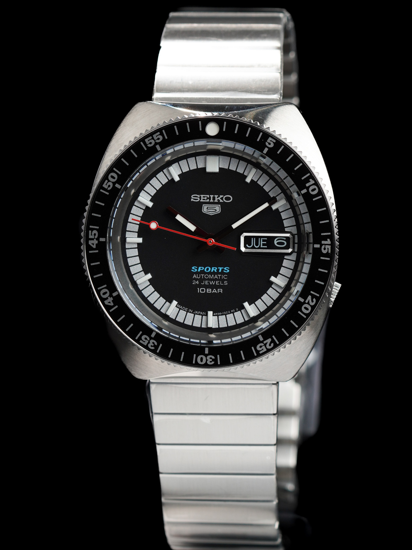 This Seiko 5 Sports 55th Anniversary Limited Edition features a 39mm stainless steel case with a display case back on a stainless steel bracelet. This watch also sports a black dial with luminous hands and index dial markers covered by Hardlex crystal.