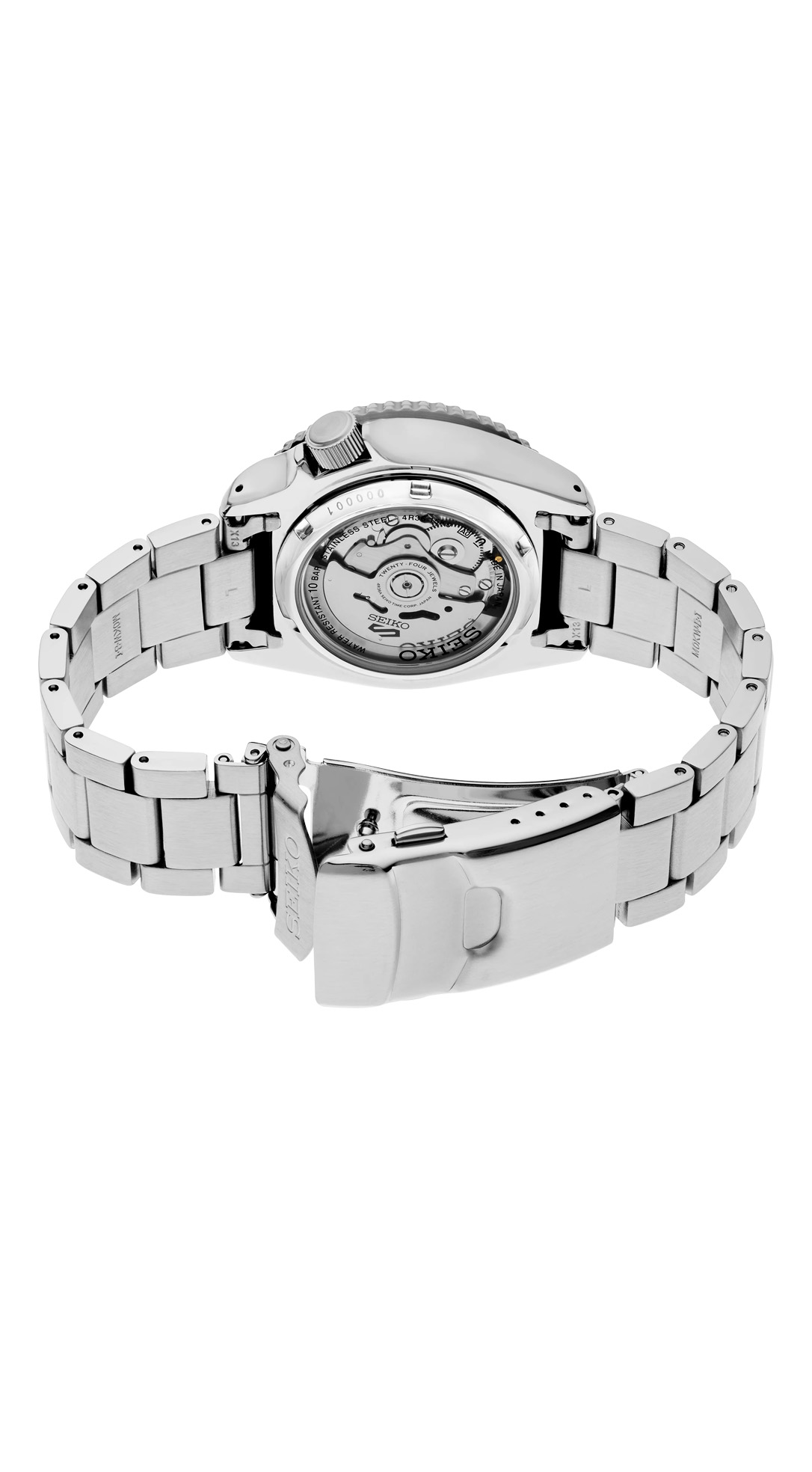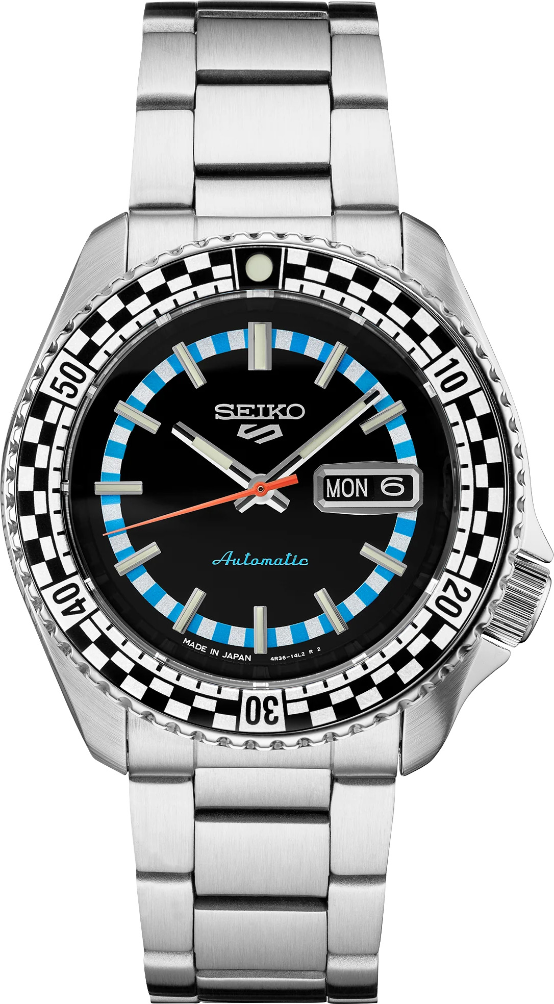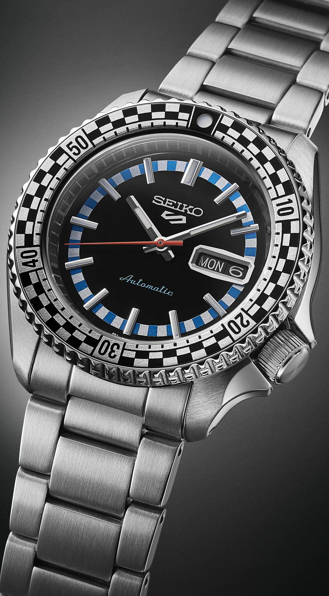 Seiko 5 Sports Special Edition. For decades, Seiko 5 Sports has delivered consistently high levels of reliability, durability, and performance. This dynamic watch offers current styling with a vintage feel, featuring an updated case and streamlined dial, while retaining the retro silver and blue color scheme. Inspired by the vintage Seiko 5 Sports models of the 1960s and 1970s, this timepiece is framed by a black and white checkered uni-directional rotating bezel, the black dial includes an inner white and blue checkered circle framing the indices for the numbers, a day/date calendar, red-orange second hand, and luminous hands and markers. The design takes its color scheme and bezel pattern from the "Checker Flag," one of the most popular designs of the era. Providing automatic technology that you control with every movement, the 24-jewel movement, visible through the screwdown see-through caseback, beats at a frequency of 21,600 vibrations per hour, with a power reserve of approximately 41 hours and manual winding capability. In stainless steel with locking tri-fold push button release clasp. 10 bar, 100M Water Resistant