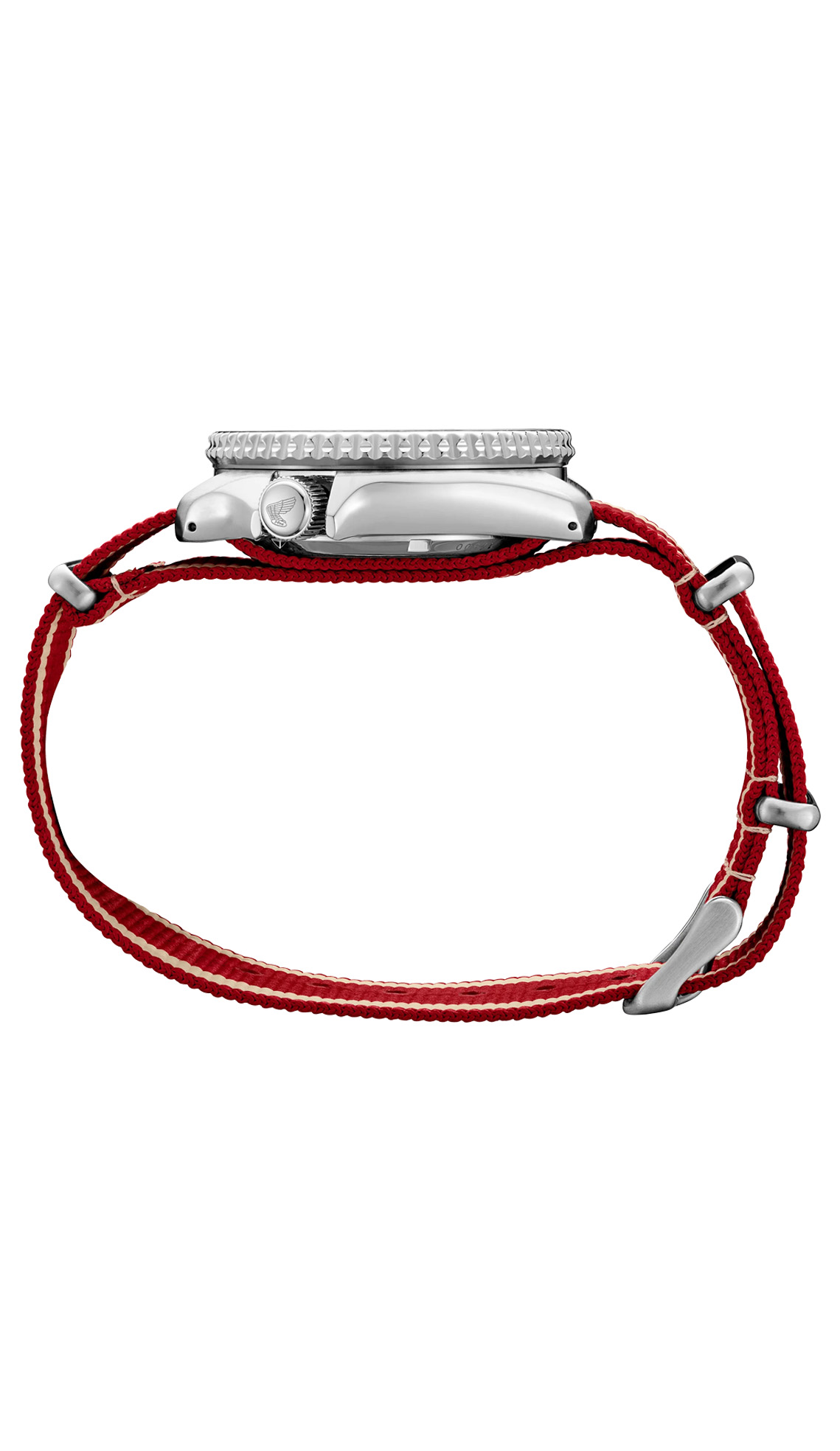 - This timepiece features a 42mm steel case paired with a high quality nylon strap. It showcases a distinctive red dial and is powered by a precise automatic winding movement. The watch is designed with a water resistance of up to 100m.
