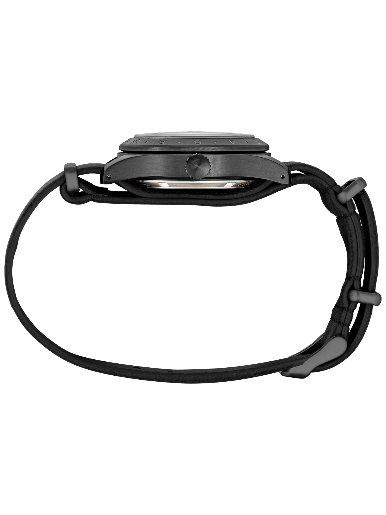 For the first time, the Seiko 5 Sports Field series introduces a new watch with a GMT function. The prominent, five-sided GMT hand in red enhances legibility against the black dial. The thick, curved glass lends the watch an air of sophistication ideally suited for travelers.