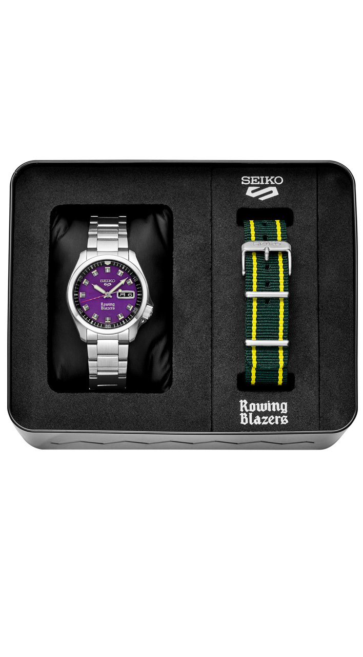 The new Seiko x Rowing Blazers capsule, designed by Rowing Blazers founder Jack Carlson and vintage watch expert Eric Wind, utilizes the same platform as the brands’ previous collaboration and is based on a 1970 Seiko 6106-7107 70m Sport Diver offered in four new summer colors: pink, yellow, purple, and a white dial with hour markers in our signature croquet stripe motif.