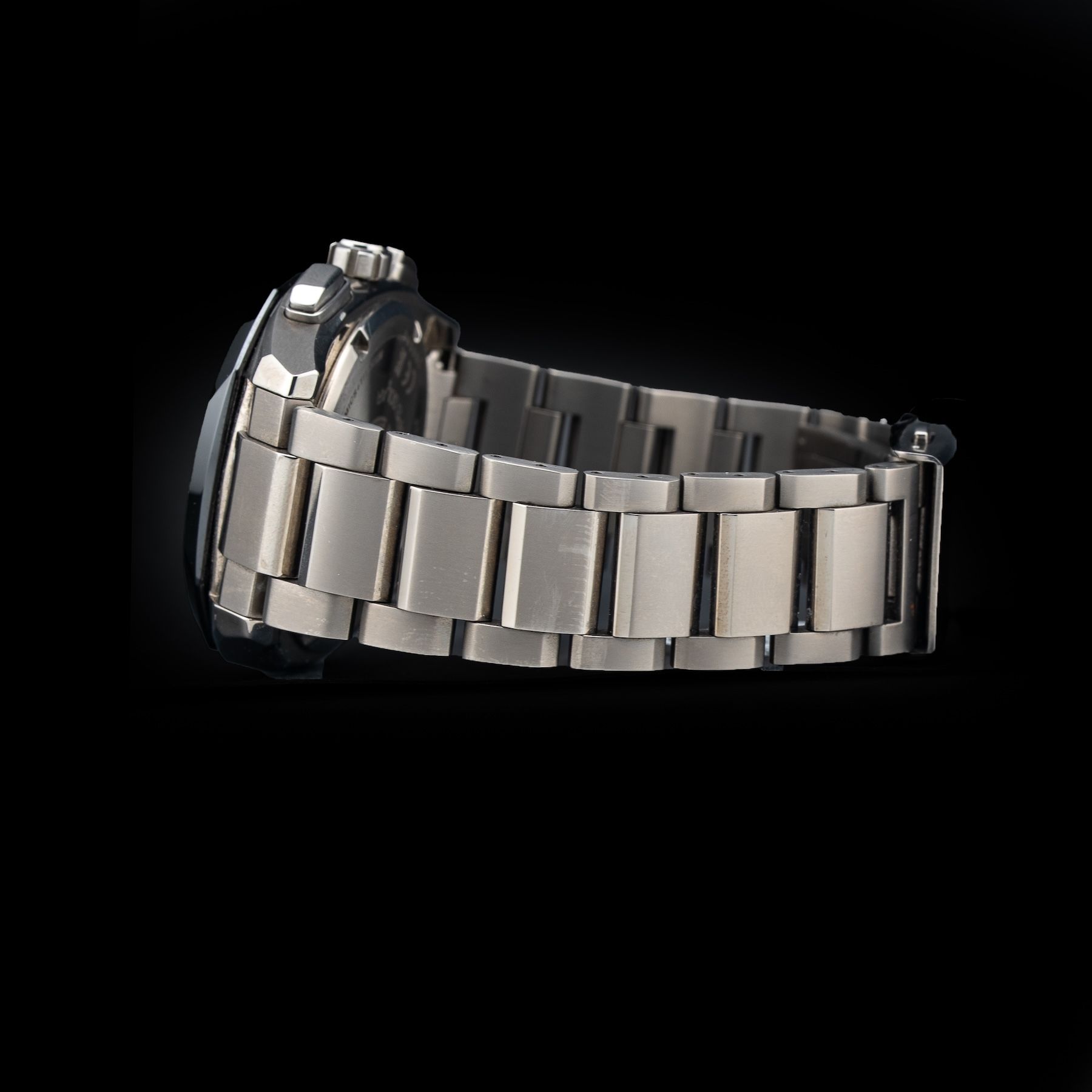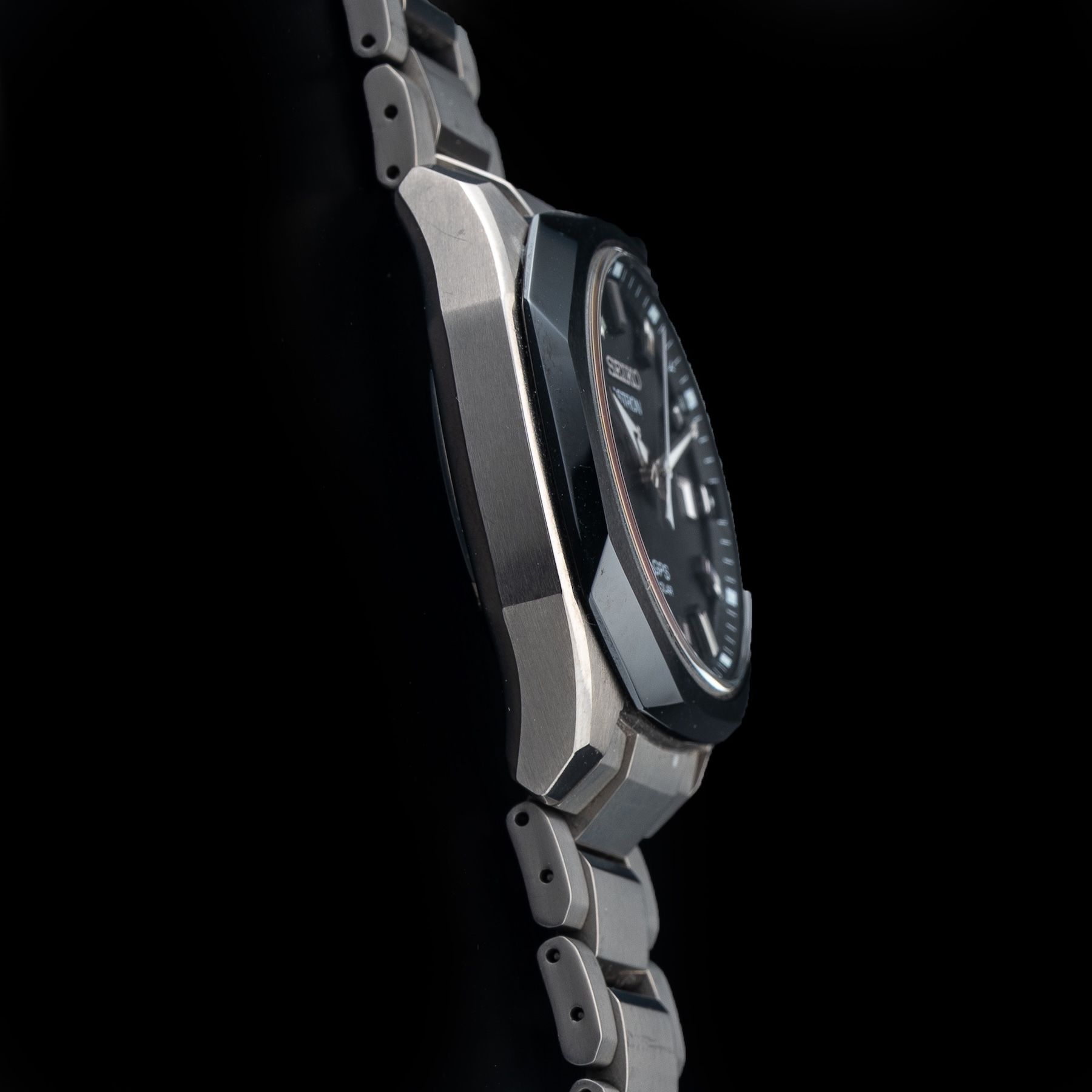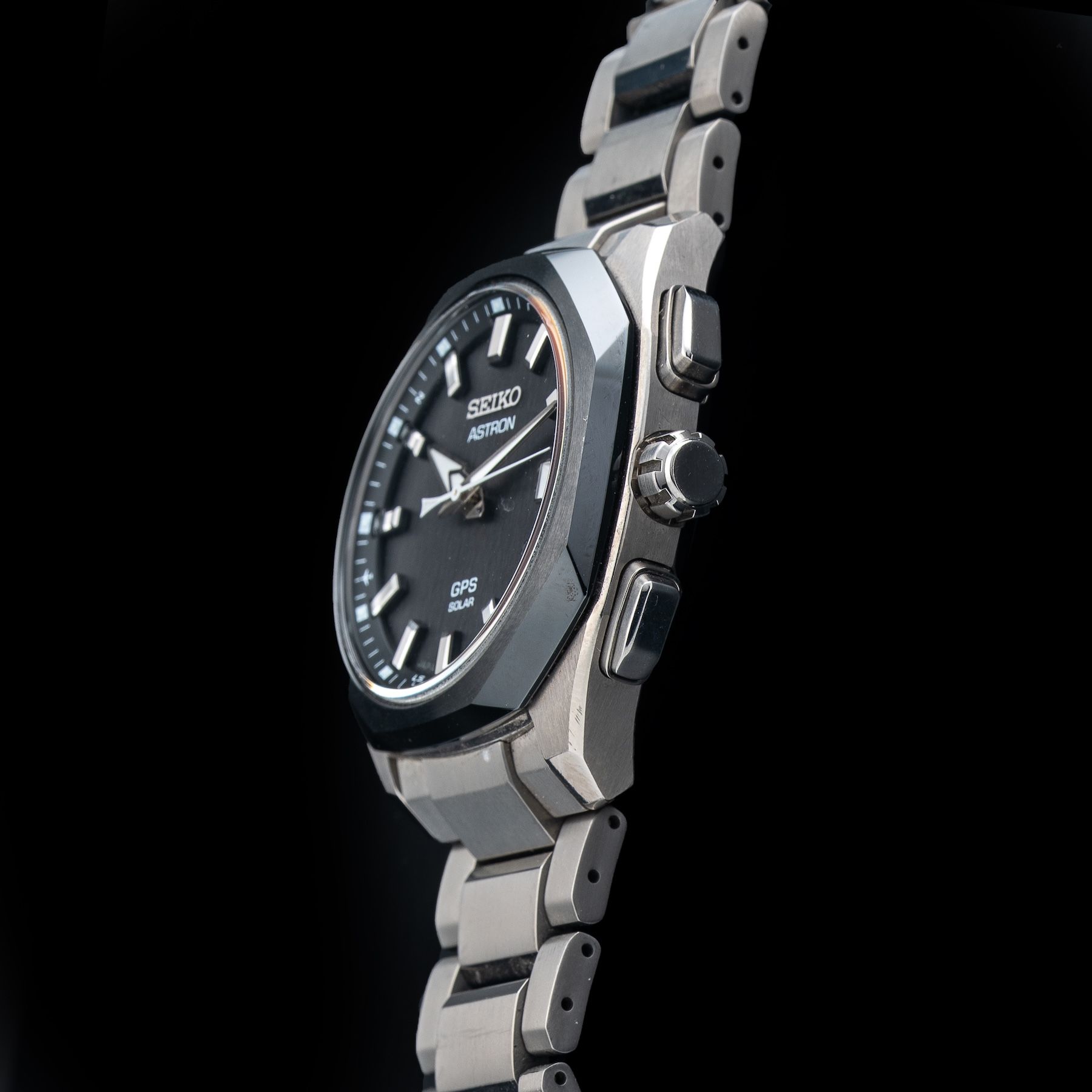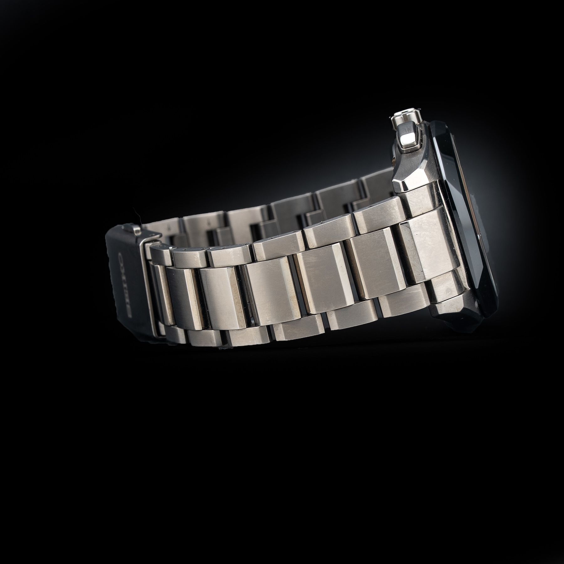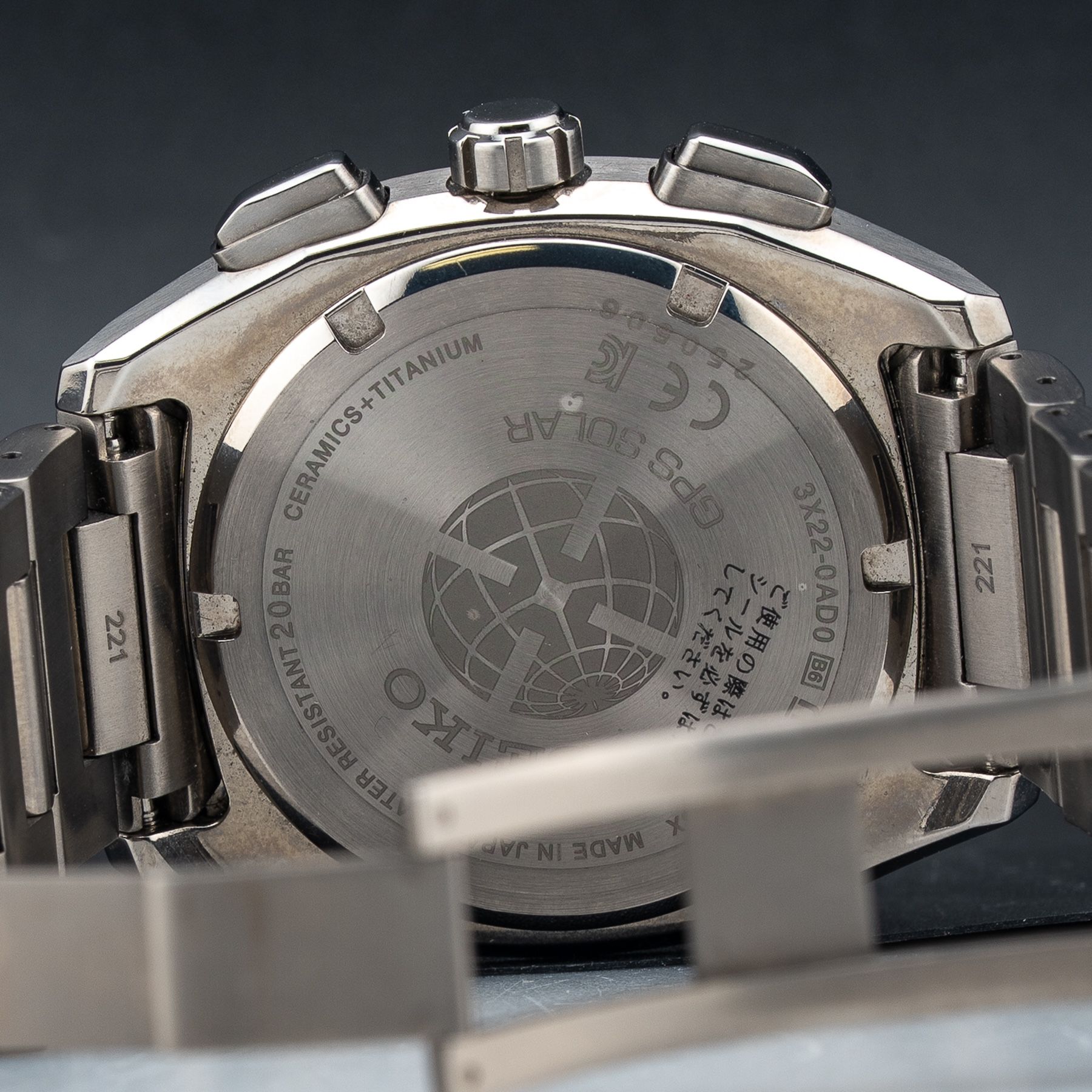 This watch features a 39mm titanium case on titanium bracelet. This watch also sports a black dial. Powered by a solar quartz movement. Water resistance up to 200 meters.