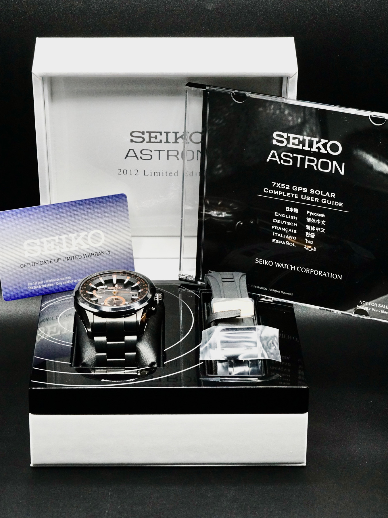 This Seiko Astron SAST100 GPS Solar is in GREAT condition. This watch includes its Original Box, Original Papers and Warranty Dated 2013. Extra black rubber strap. This watch has been fully authenticated and certified by Exquisite Timepieces.Please note, the photos shown are of the actual watch you will receive.