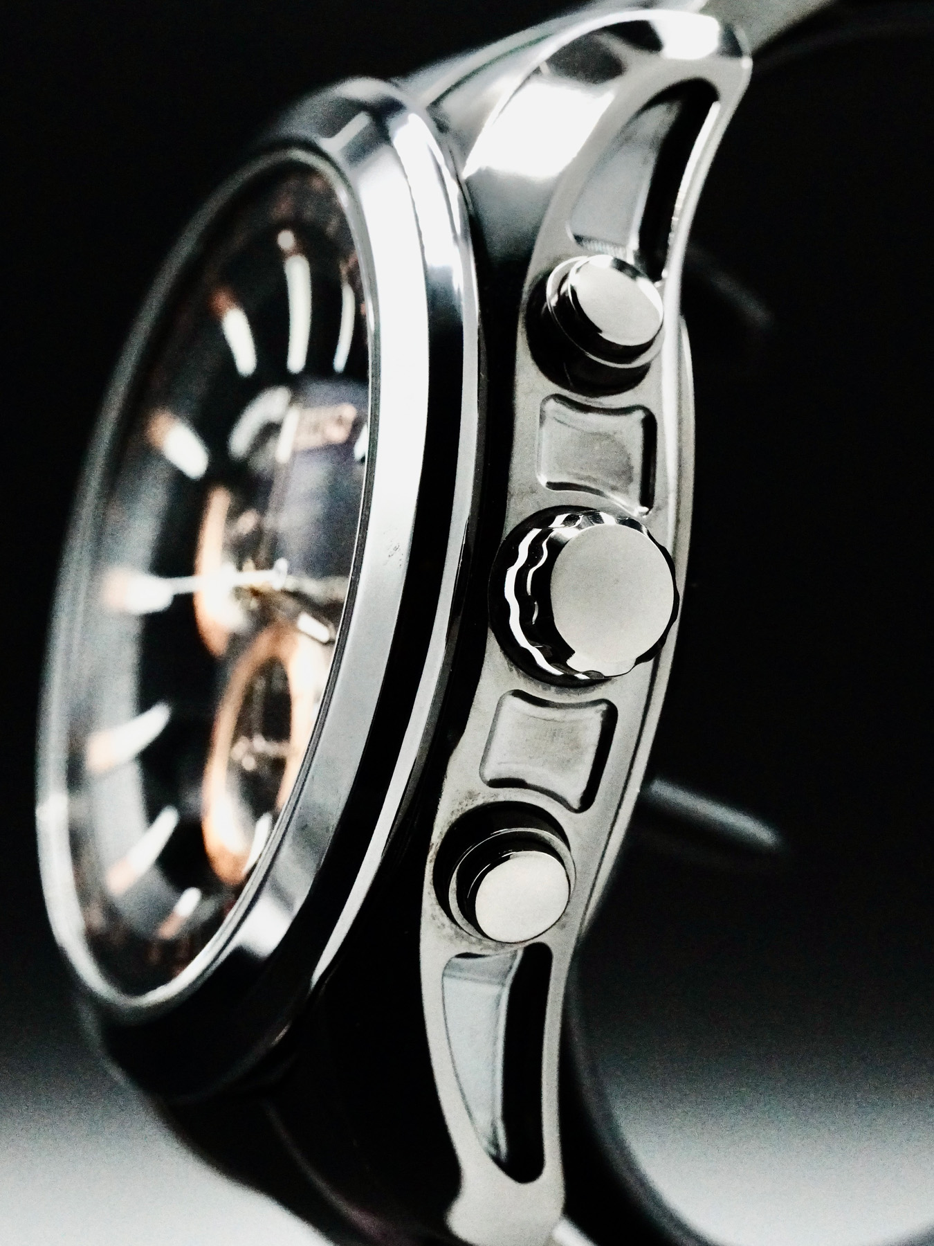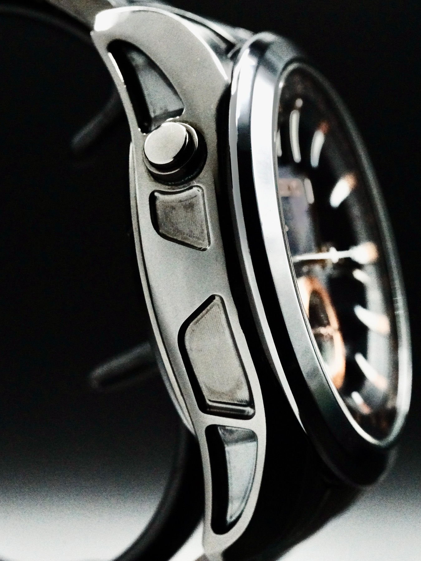 This watch features a 47 mm high-intensity case on leather strap. This watch also sports a black dial. Powered by a solar movement. Water resistance up to 100 meters.