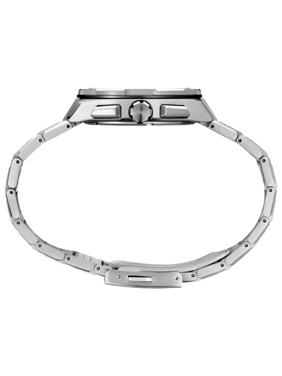 The bezel features a two-layer structure combining different metals. The case, bracelet, and dial are designed in a single silver tone, creating a metallic internal spaceship atmosphere.
