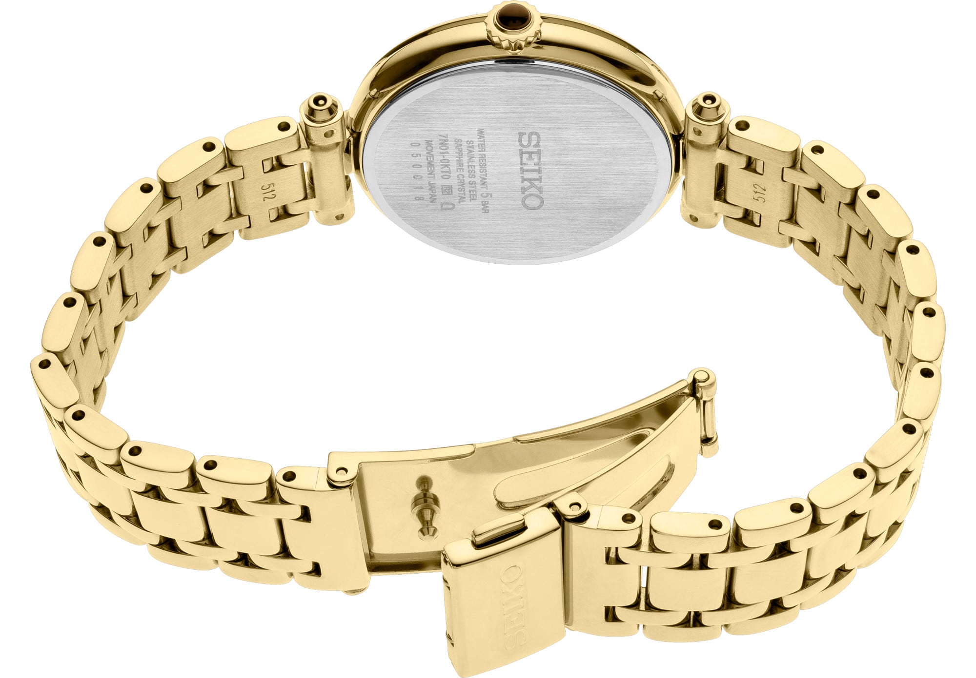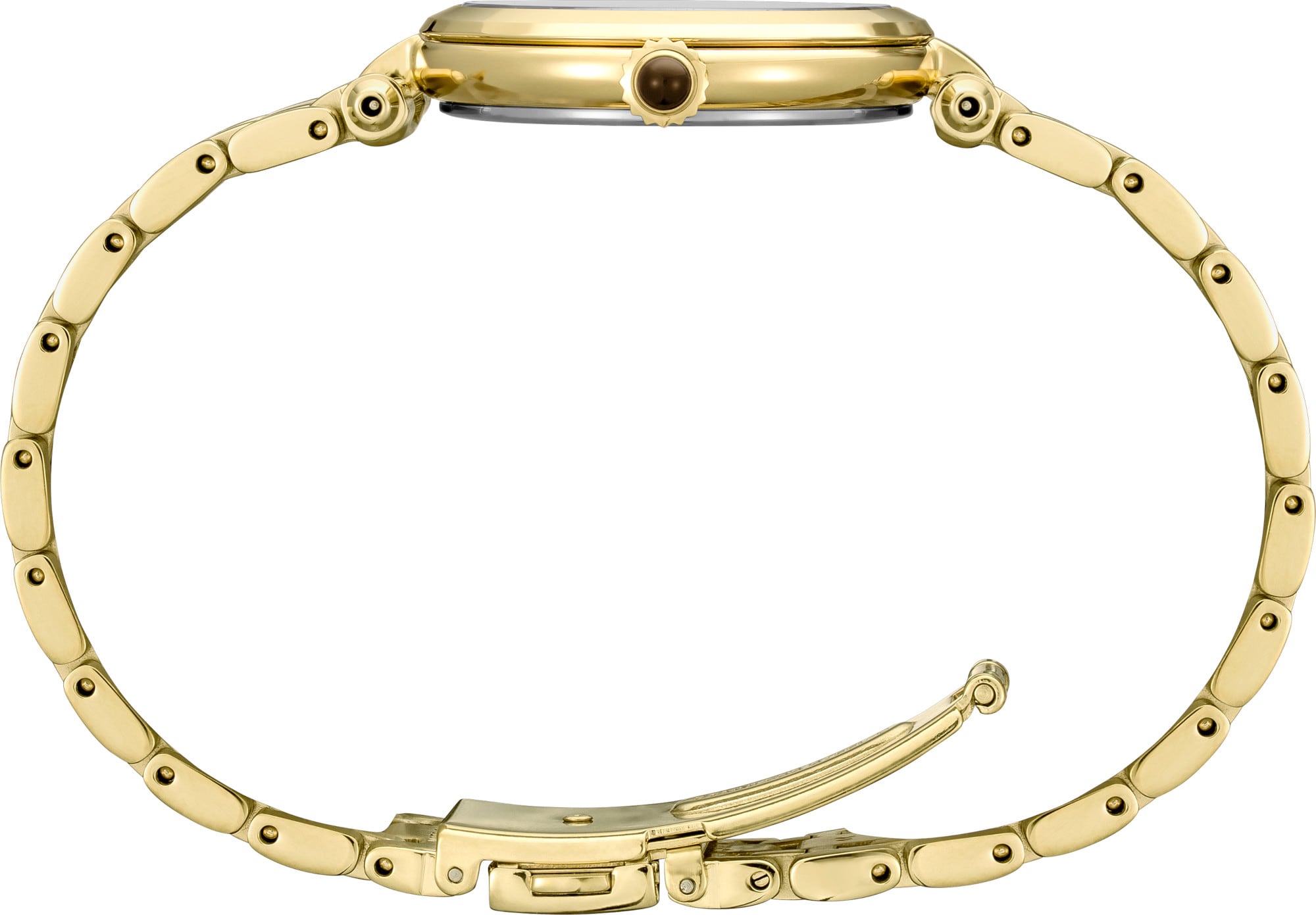 From the Diamond Collection. Designed to dazzle - the Diamond Collection provides the perfect dash of brilliance for any occasion. Offering an elegant jewelry-inspired look, this sophisticated design features a mother-of-pearl dial with gold hands and 12 diamond markers. Crafted of stainless steel, with gold finish, classic cabochon crown, and a sapphire crystal for superior scratch resistance. 5 bar, 50M Water Resistant.