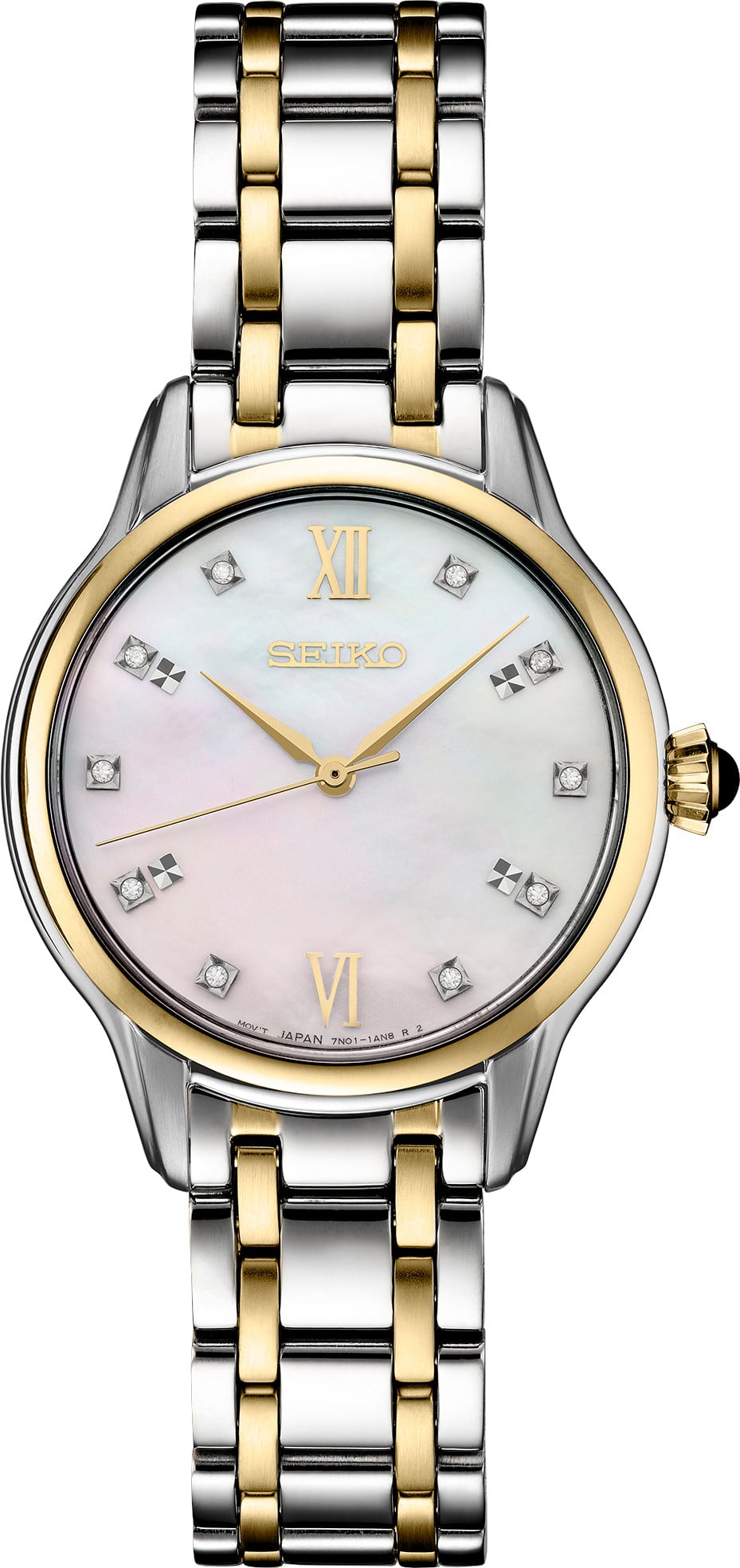 From the Diamond Collection. With elegant simplicity, this beautifully balanced design, perfect for dress or everyday wear, features a shimmering mother-of-pearl dial set with 10 diamonds. Crafted of stainless steel in a versatile two-tone finish, this graceful watch offers slim lines for wearing comfort and includes a scratch-resistant sapphire crystal and classic cabochon crown. 5 bar, 50M Water Resistant.