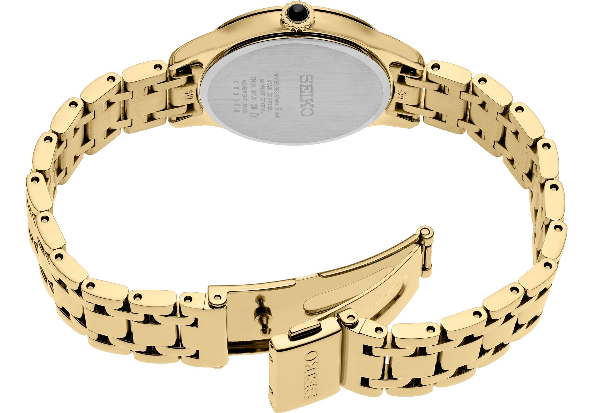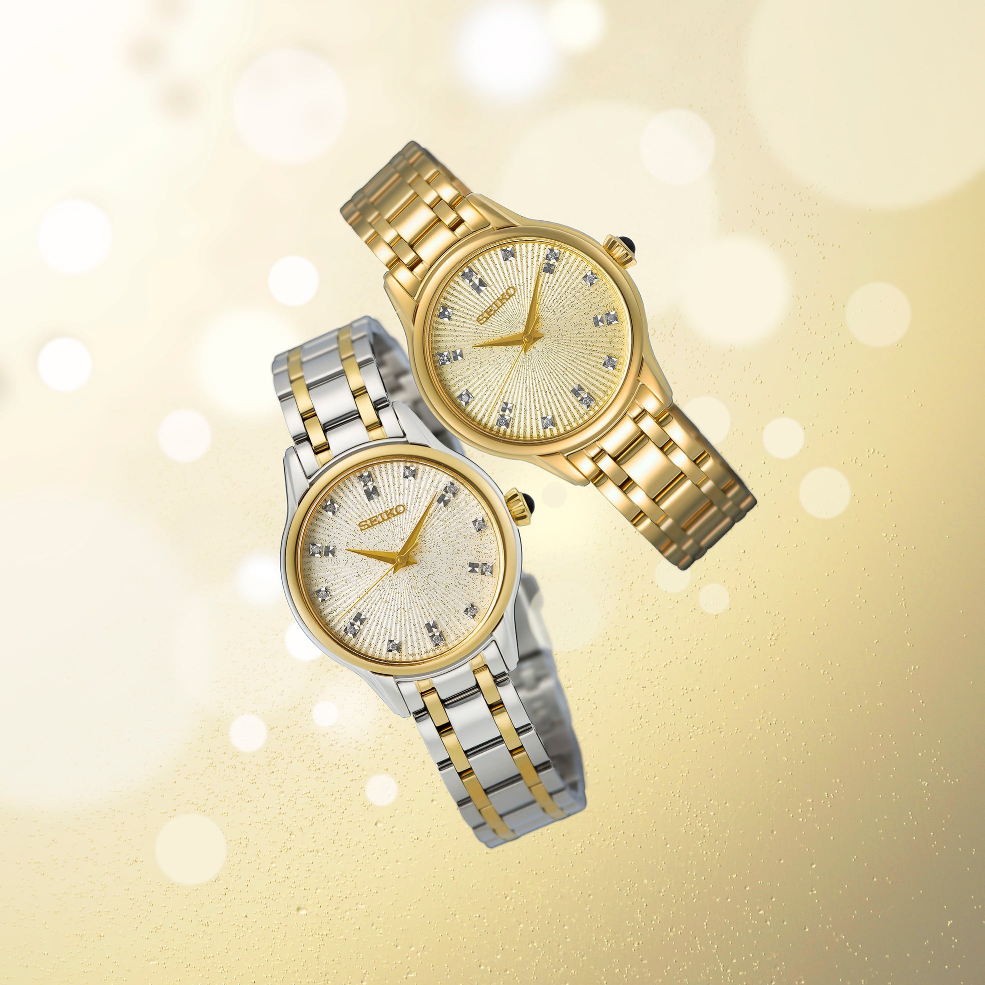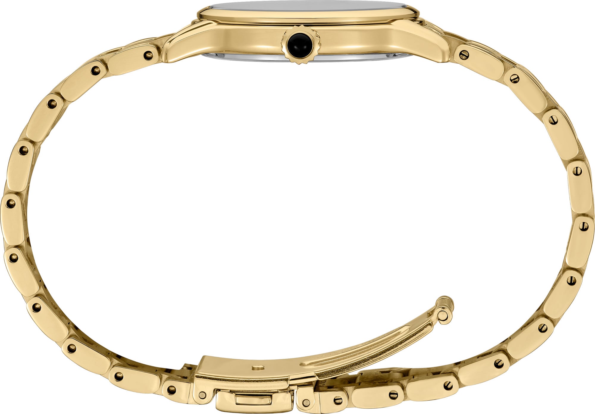 From the Diamond Collection. Elegantly streamlined, this sparkling design features 12 diamonds set on a subtly shimmering champagne dial with a pressed pattern and glitter finish. Crafted of stainless steel, in a rich gold finish, this graceful watch includes a scratch-resistant sapphire crystal, classic cabochon crown, and tri-fold push button release clasp. 5 bar, 50M Water Resistant