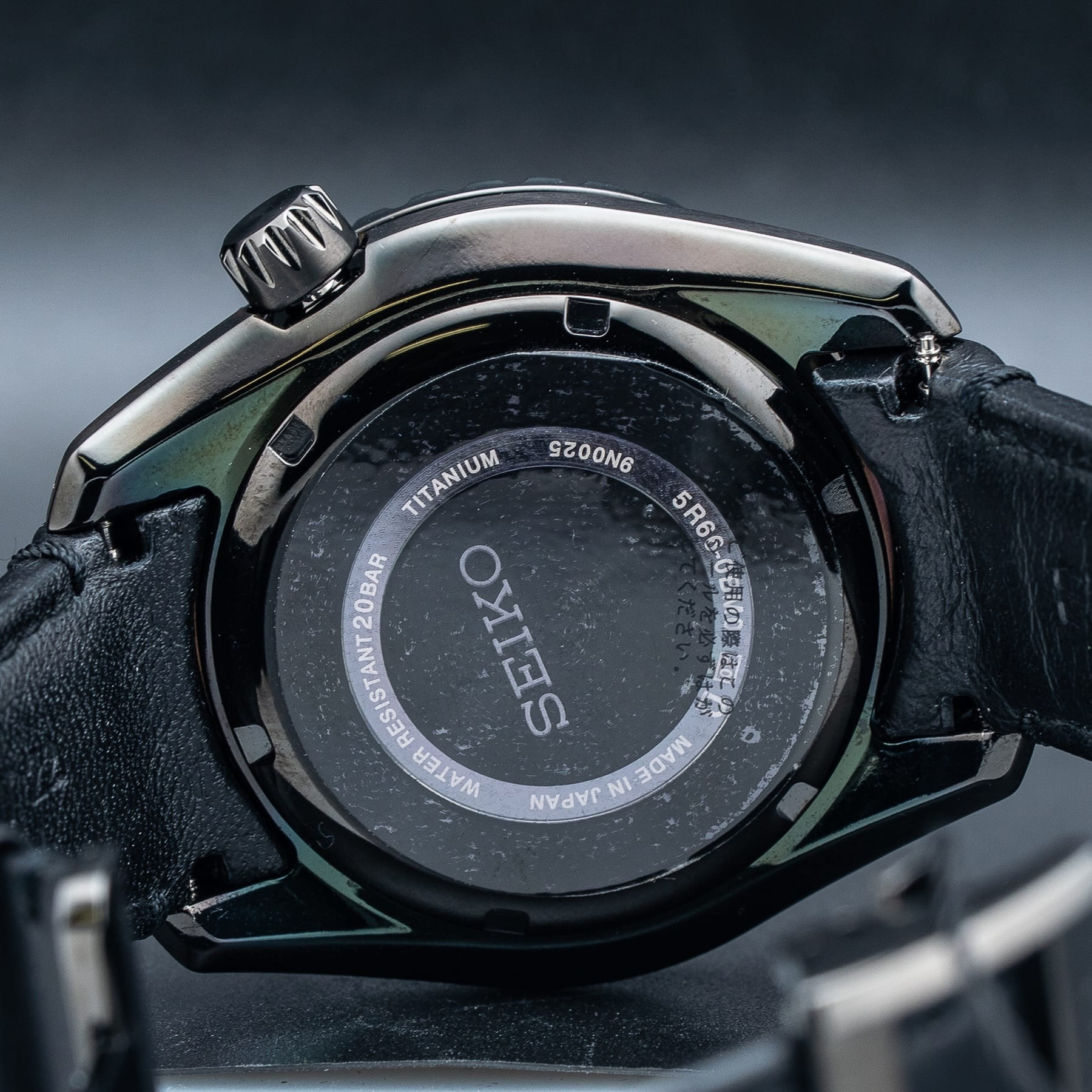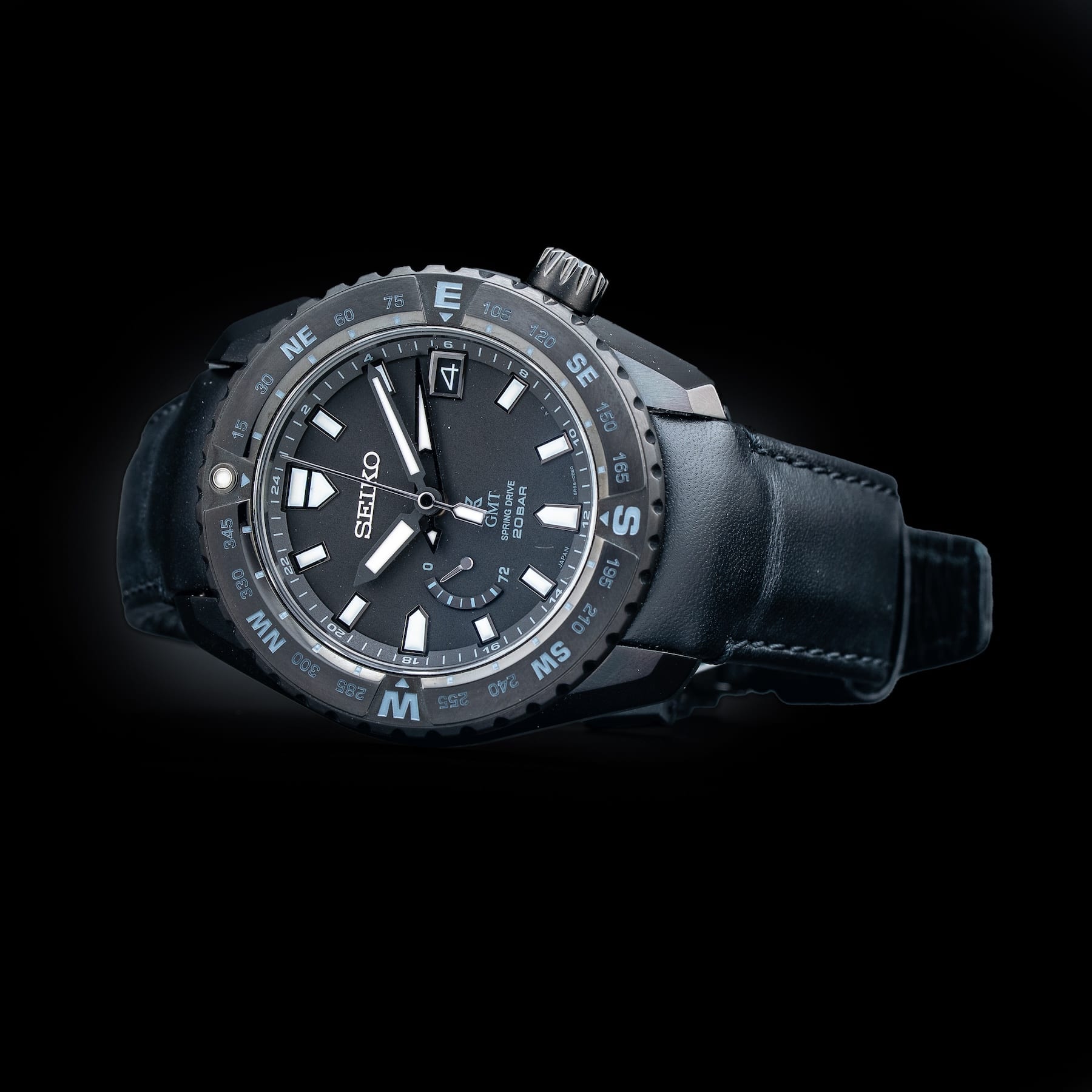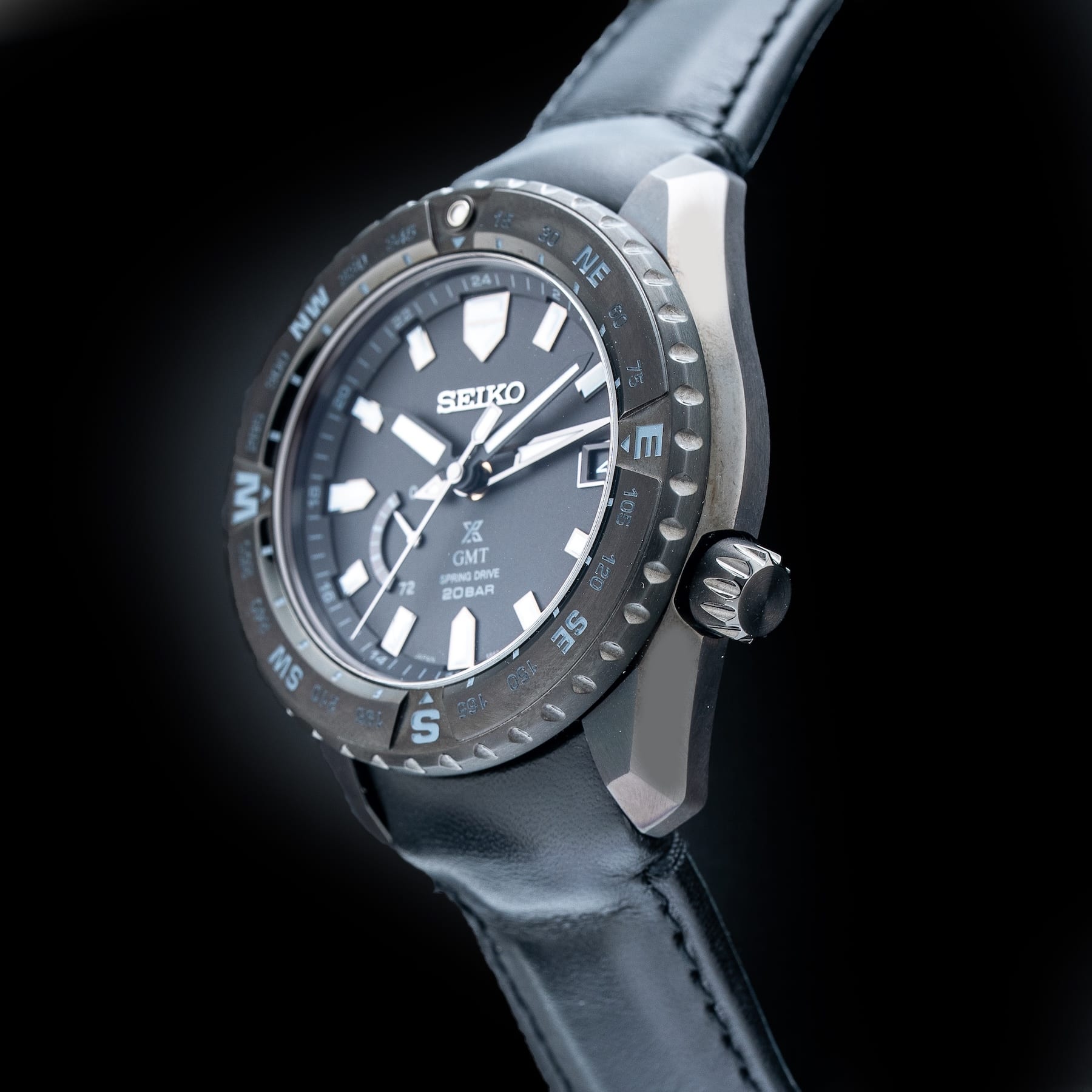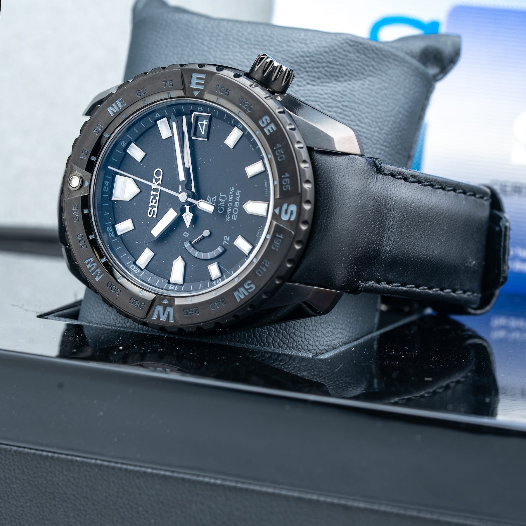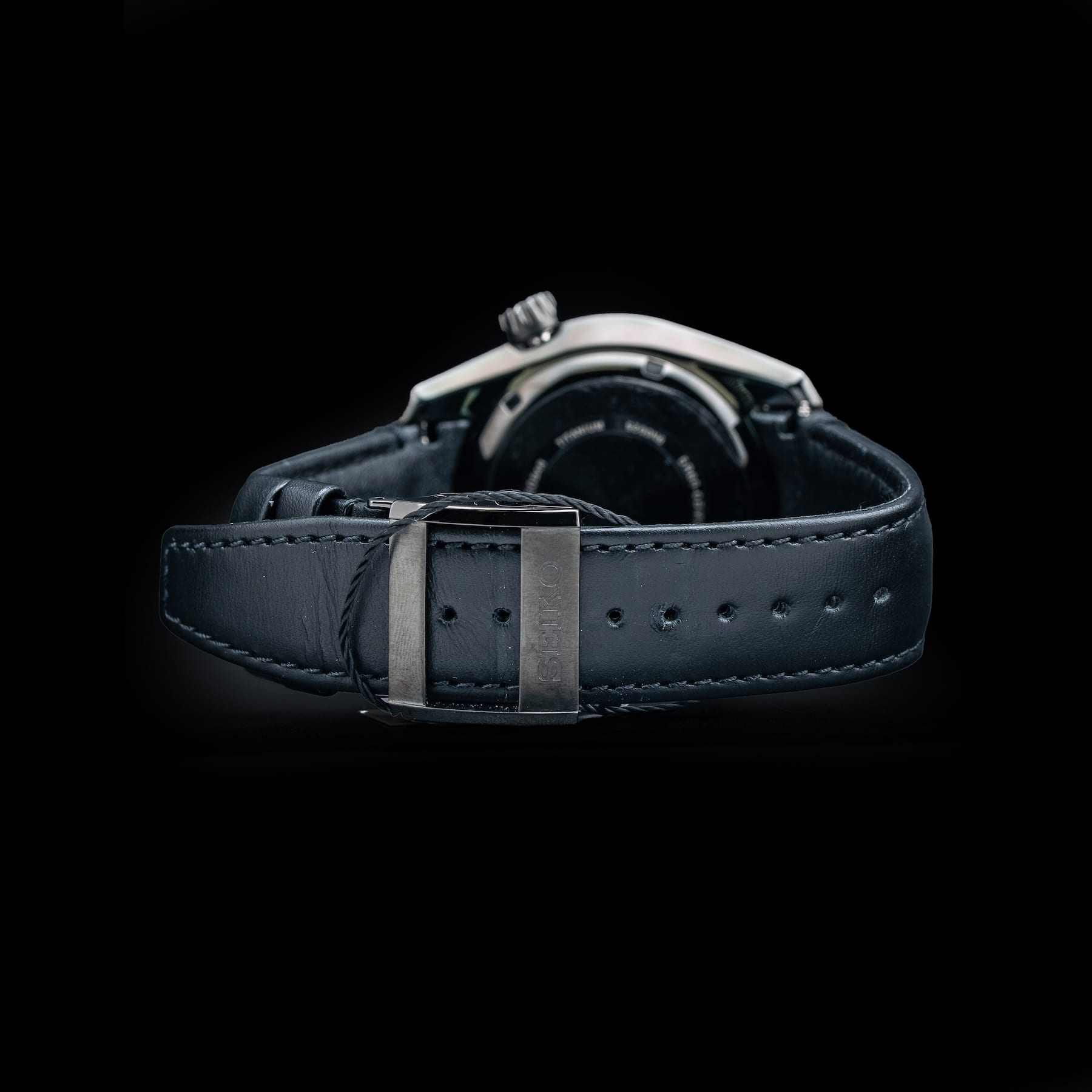 This watch features a 44.8mm titanium case on leather strap. This watch also sports a black dial. Powered by a spring drive movement. Water resistance up to 200 meters.