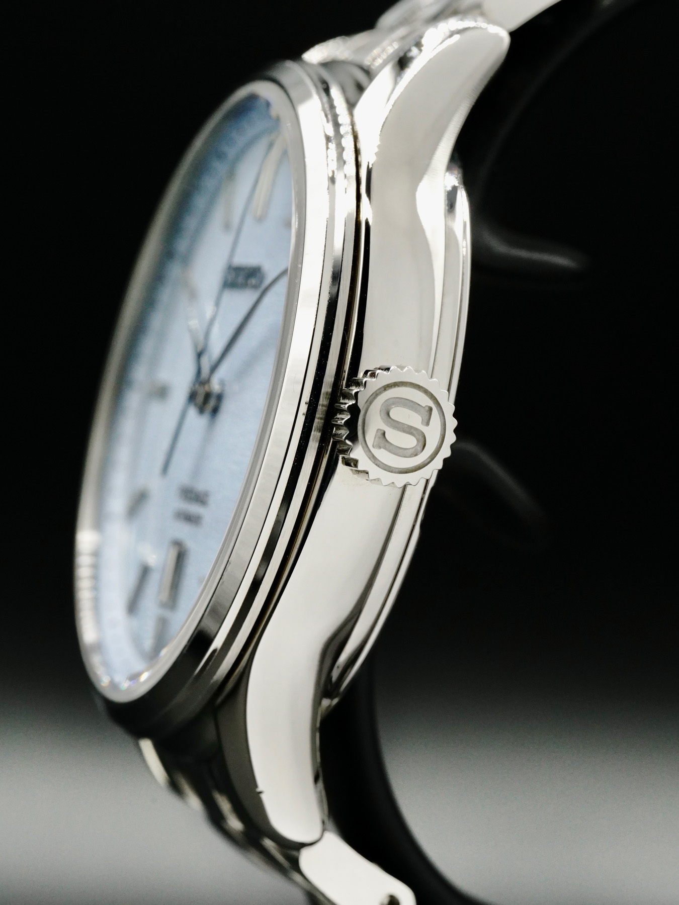 This Seiko Presage Japanese Garden Collection SRPF53 features a 41mm steel case on steel bracelt. This watch also sports a blue dial.