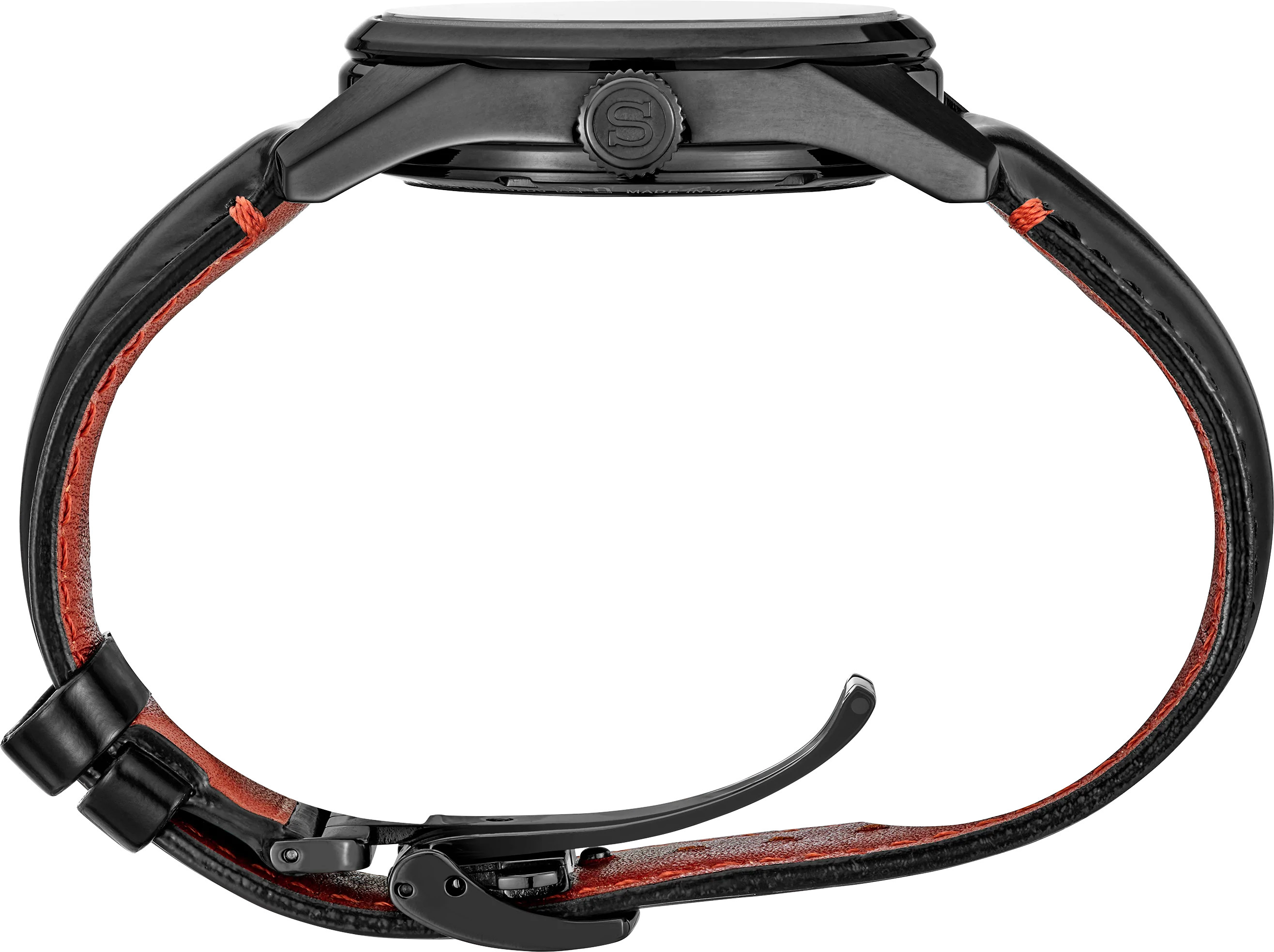Presage Sharp-Edged Series Limited Edition. Offering the finest in Japanese mechanical watchmaking, the Presage Collection blends precision technology with superior craftsmanship and design. This extraordinary Limited Edition from the Sharp-Edged Series, available only in a controlled-production run of 2,000, with the serial number engraved on each caseback, roots the fresh, clean angularity of contemporary Japanese design in a deeper tradition, drawing its inspiration from Japanese Kabuki, the centuries-old performing art that, like the watch series, strives to create new forms by combining modern culture with historical themes. Like other Sharp-Edged Series styles, this memorable watch features a gloss-finish dial patterned with an Asanoha hemp-leaf motif, a symbol of growth and prosperity dating to the Heian Period (794-1185 AD) that was also used in Kabuki costumes in the Edo Period (1603-1867 AD), here in the reddish-brown Kakiiro color, named after a Kabuki master who favored it. With sharp gold accents to highlight the intricate pattern, the dial includes a date calendar. The sapphire crystal has anti-reflective coating on the inner surface, while the black cordovan strap with Kakiiro colored lining is secured by a tri-fold push button release clasp. In stainless steel with black hard coating, this exceptional timepiece offers a 24-jewel automatic movement that beats at a frequency of 21,600 vibrations per hour, with a power reserve of approximately 70 hours and manual winding capability. Packaged in a Limited Edition collectors' box. 10 bar, 100M Water Resistant.