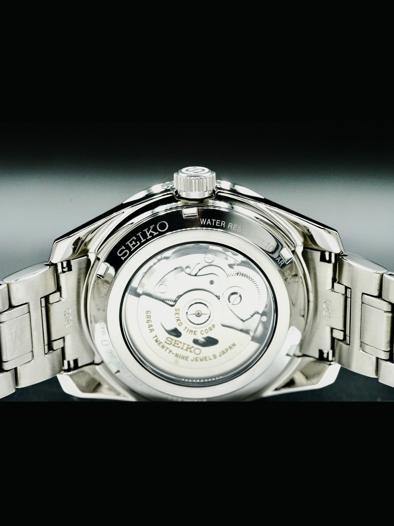 Mechanical Automatic movement powered by Seiko Caliber 6R64 with a power reserve of approximately 45 hours. Water resistance up to 100 meters.