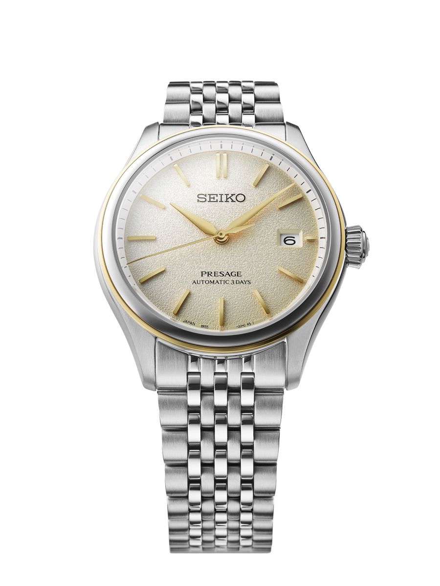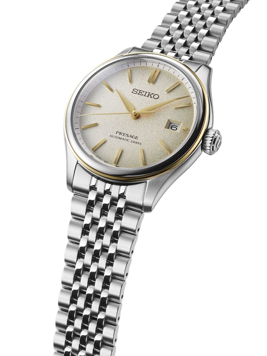 Presage Classic Series. Offering the finest in Japanese mechanical watchmaking, the Presage Collection blends precision technology with superior craftsmanship and design. The Presage Classic Series draws from the colors, materials and textures of traditional crafts, each timepiece gracefully expressing Japan’s timeless beauty. In “shiro-iro,” the color of unbleached natural silk, the curved dial of this streamlined design has a richly textured pattern that evokes the lustrous fabric, while capturing and reflecting ambient light to create a heightened sense of depth and beauty. With gold accents to symbolize nobility and sacredness, in a color often used for celebrations, the elegant and classic style of the design is further enhanced. Visible through the screwdown, see-through caseback, Seiko’s 6R caliber, 24-jewel automatic movement beats at a frequency of 21,600 vibrations per hour, with an exceptional power reserve of 72 hours, manual winding capability and a date calendar complication. Crafted of stainless steel, the case is constructed with smooth curved surfaces and includes a dual curved sapphire crystal, echoing the contours of the dome-shaped dial. The retro-inspired multi-row bracelet with curved top surfaces helps achieve a superbly sleek and comfortable fit and is equipped with a deployment clasp with push button release. 10 bar, 100M Water Resistant