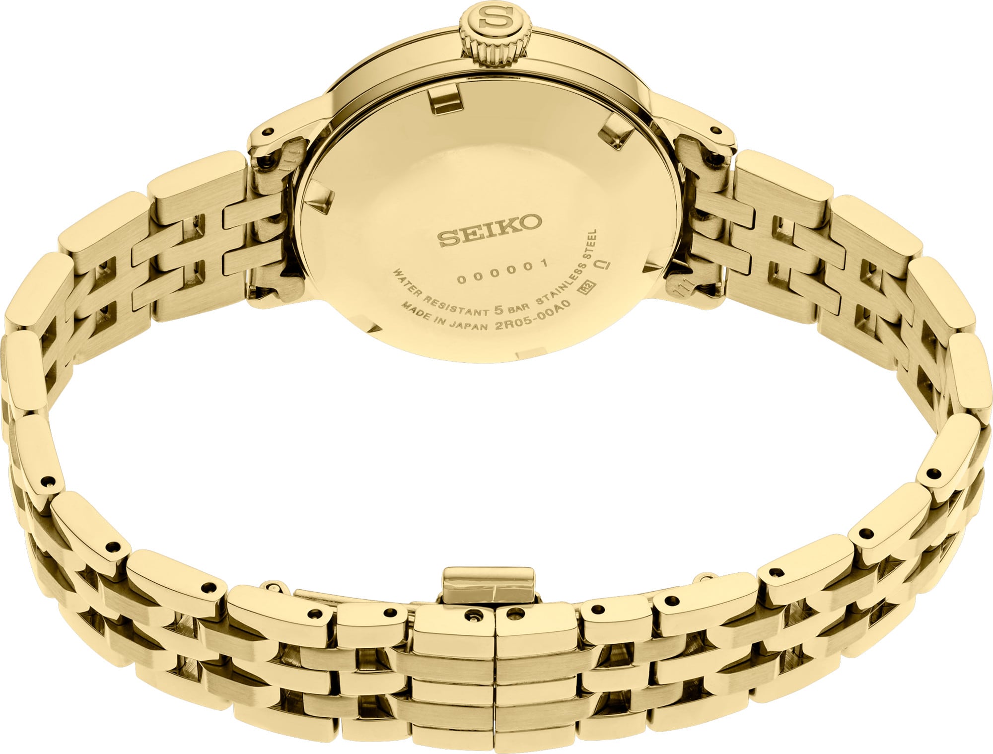 Seiko Presage Cocktail Time. Offering the finest in Japanese mechanical watchmaking, the Presage Collection blends precision technology with superior craftsmanship and design. Inspired by hot cocktails under the softer sunlight of autumn and winter, this Cocktail Time series expresses the tones and hues of the cooler seasons. Atop a lovely gradated golden pressed pattern dial evoking the Eggnog cocktail, four diamonds, artfully incorporated into the signature markers, add a luxurious sparkle to the extraordinary design. The gracefully slender case houses a slim, 21 jewel automatic movement, which beats at a frequency of 21,600 vibrations per hour, with a power reserve of approximately 41 hours and manual winding capability. Crafted of stainless steel with gold finish, this sleek timepiece includes an elegantly tapered five-row bracelet, with mirror finish for added brilliance, as well as a date calendar, box shaped crystal, and deployment clasp with push button release. 5 bar, 50M Water Resistant.