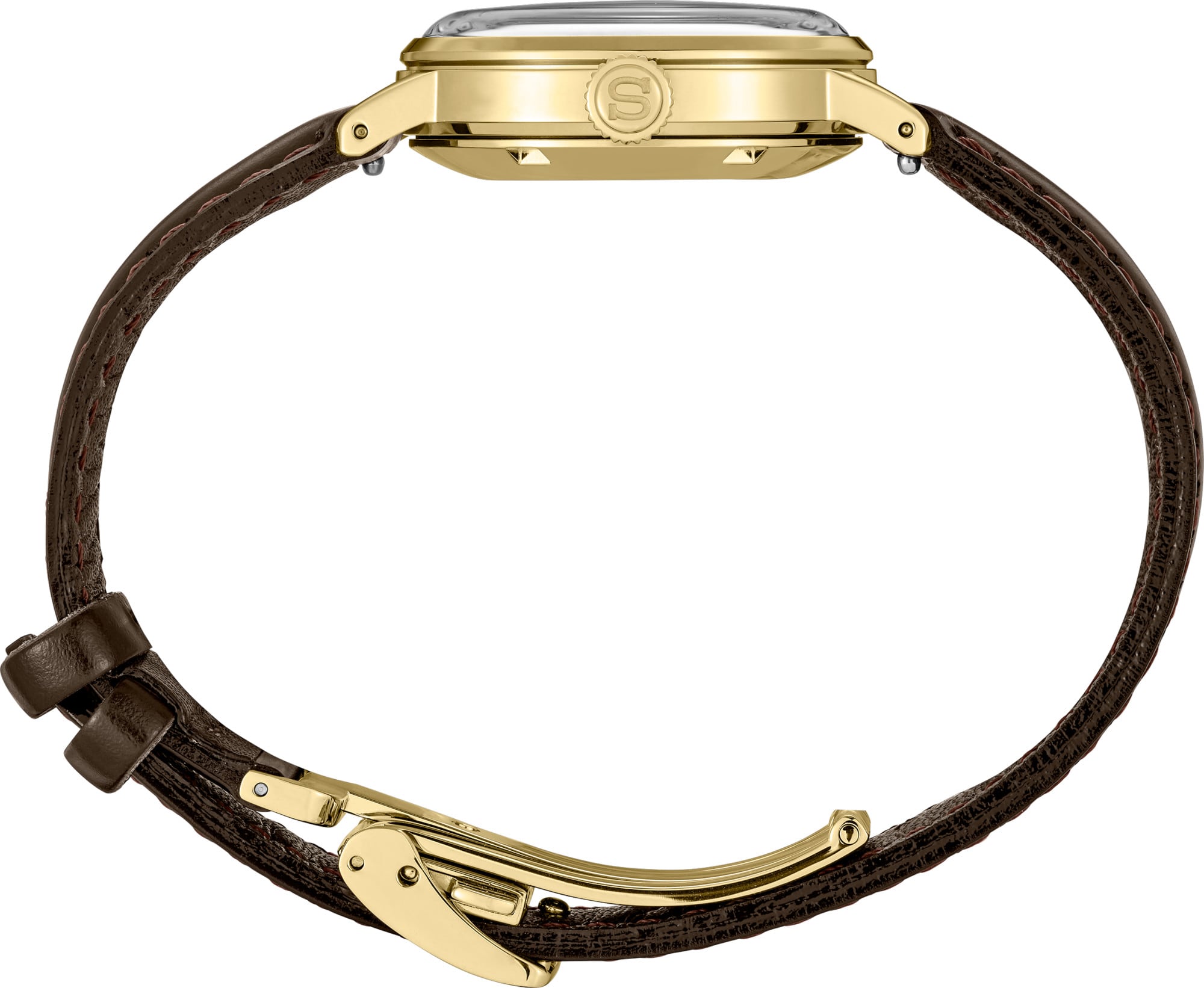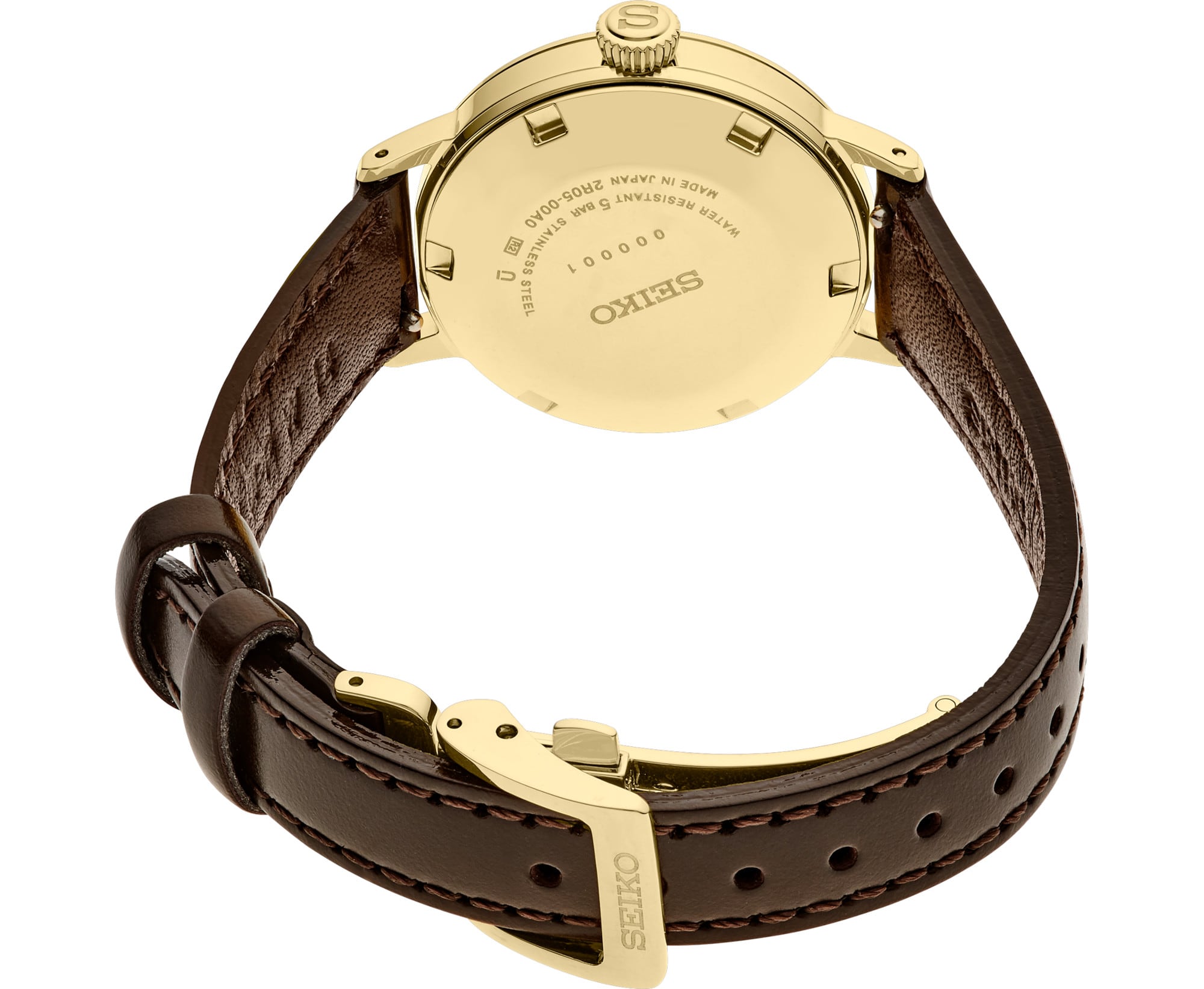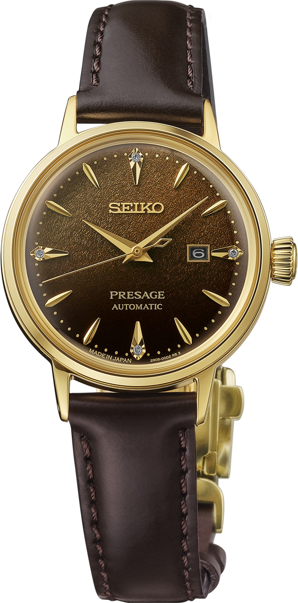 Seiko Presage Cocktail Time. Offering the finest in Japanese mechanical watchmaking, the Presage Collection blends precision technology with superior craftsmanship and design. Inspired by hot cocktails under the softer sunlight of autumn and winter, this Cocktail Time series expresses the tones and hues of the cooler seasons. Atop a lovely gradated brown pressed pattern dial evoking the Jamaican Coffee cocktail, four diamonds, artfully incorporated into the signature markers, add a luxurious sparkle to the extraordinary design. The gracefully slender case houses a slim, 21 jewel automatic movement, which beats at a frequency of 21,600 vibrations per hour, with a power reserve of approximately 41 hours and manual winding capability. Crafted of stainless steel with gold finish, this sleek timepiece includes an elegant brown leather strap as well as a date calendar, box shaped crystal, and tri-fold clasp with push button release. 5 bar, 50M Water Resistant