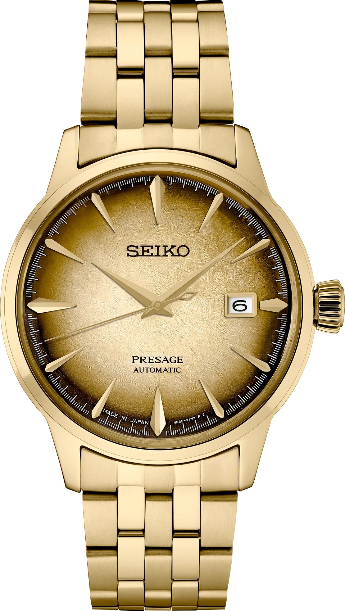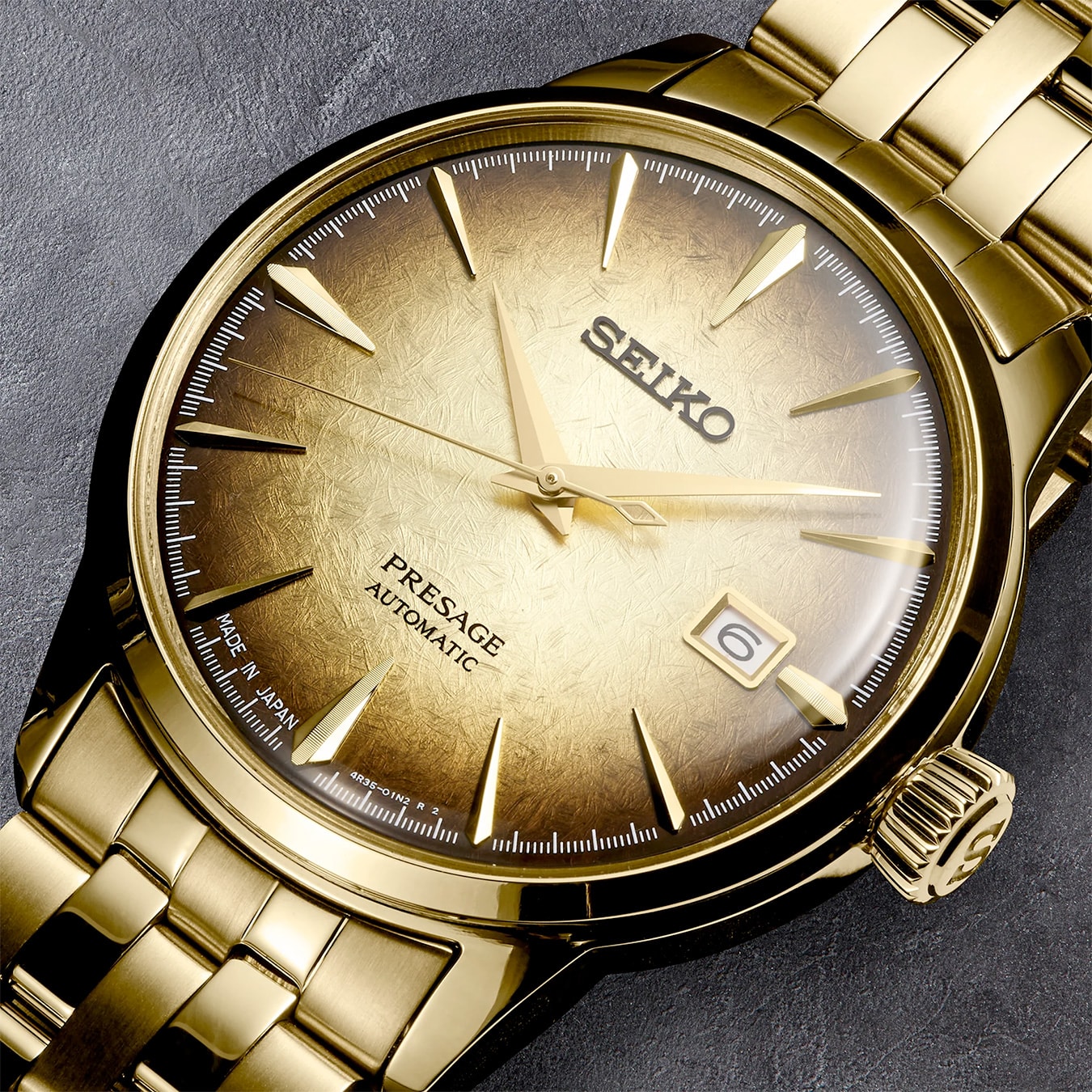 Seiko Presage Cocktail Time U.S. Special Creation now available in select markets globally. Offering the finest in Japanese mechanical watchmaking, the Presage Collection blends precision technology with superior craftsmanship and design. Celebrating craft beer cocktails, as one of the first two watches in the Cocktail Time Collection to offer a gold case and bracelet finish, this shimmering design, inspired by the Half and Half cocktail, is highlighted by a gloss-finish gold and brown dial with radial gradations to suggest the distinct hues of a fresh pour, while the pressed pattern evokes its bubbling effervescence. The 23-jewel automatic movement, visible through the screwdown see-through caseback, beats at a frequency of 21,600 vibrations per hour, with a power reserve of approximately 41 hours and manual winding capability. Crafted of stainless steel, this distinctive timepiece includes a calendar, box-shaped crystal, and deployment clasp with push button release. 5 bar, 50M Water Resistant