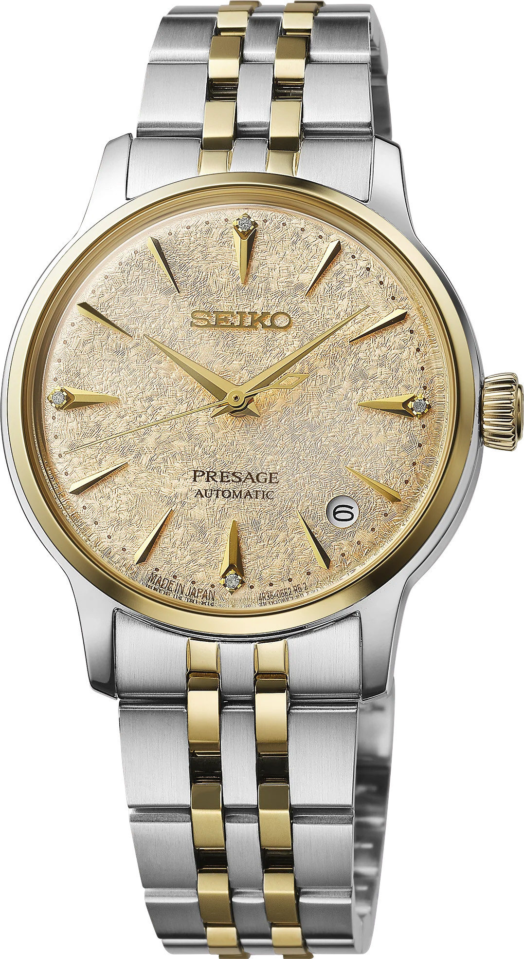 Seiko Presage Cocktail Time. Offering the finest in Japanese mechanical watchmaking, the Presage Collection blends precision technology with superior craftsmanship and design. Offering a graceful and fresh twist to the popular Cocktail Time series, this charming watch, inspired by the Frozen Banana Daiquiri cocktail, features a lovely light champagne dial. With a stunning pressed pattern evoking crunchy ice. Four diamonds, artfully incorporated into the signature wedge-shaped markers at 12, 3, 6, and 9 o’clock, add a luxurious sparkle. The streamlined case houses a 23-jewel automatic movement, which beats at a frequency of 21,600 vibrations per hour, with a power reserve of approximately 41 hours and manual winding capability. Crafted of stainless steel with a gold two-tone finish and a delicately tapered bracelet, this distinctive timepiece includes a date calendar, box-shaped crystal, screwdown caseback, and deployment clasp with push-button release. 5 bar, 50M Water Resistant