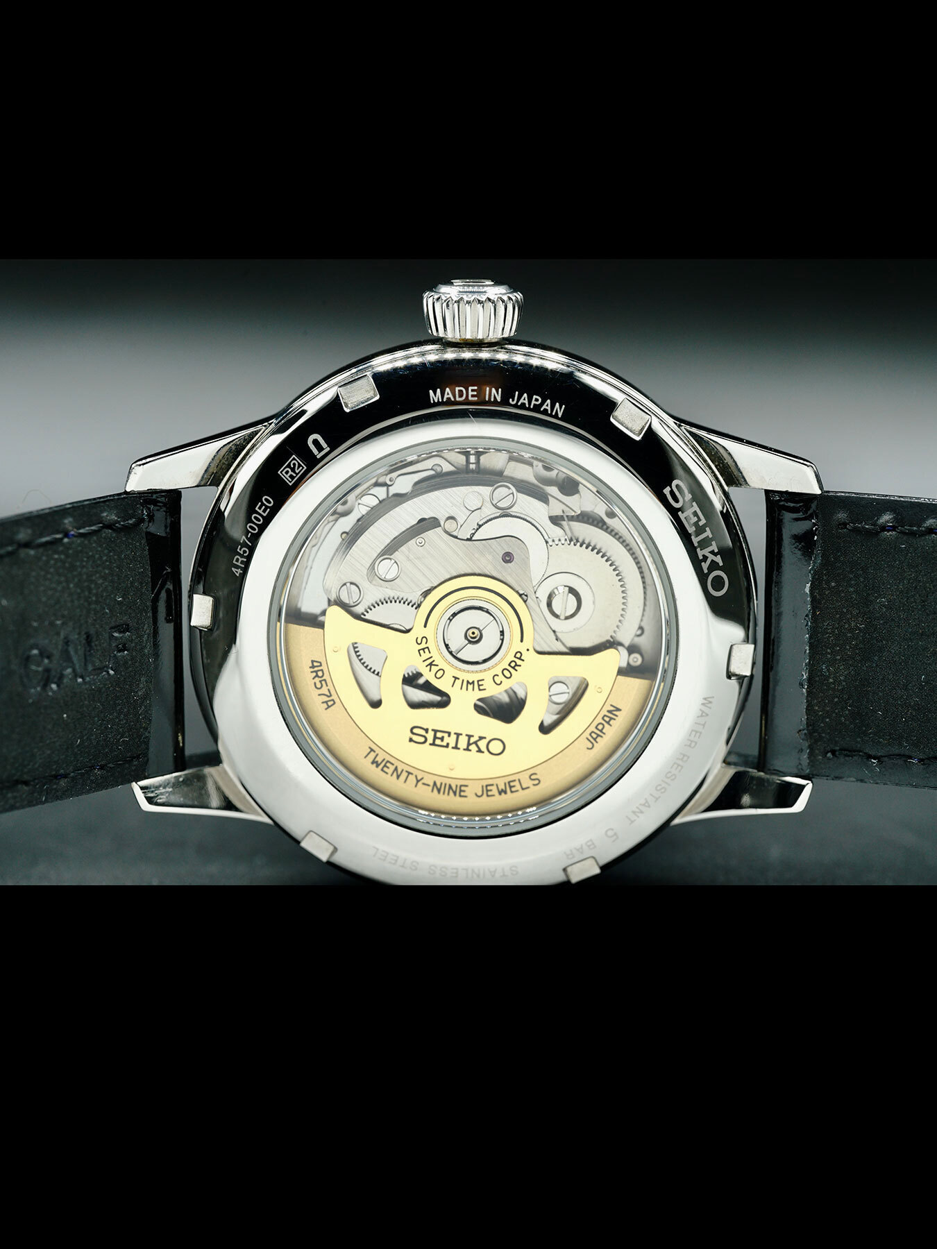 Automatic movement powered by Seiko Caliber 4R57 with a power reserve of approximately 41 hours. Water resistance up to 50 meters.