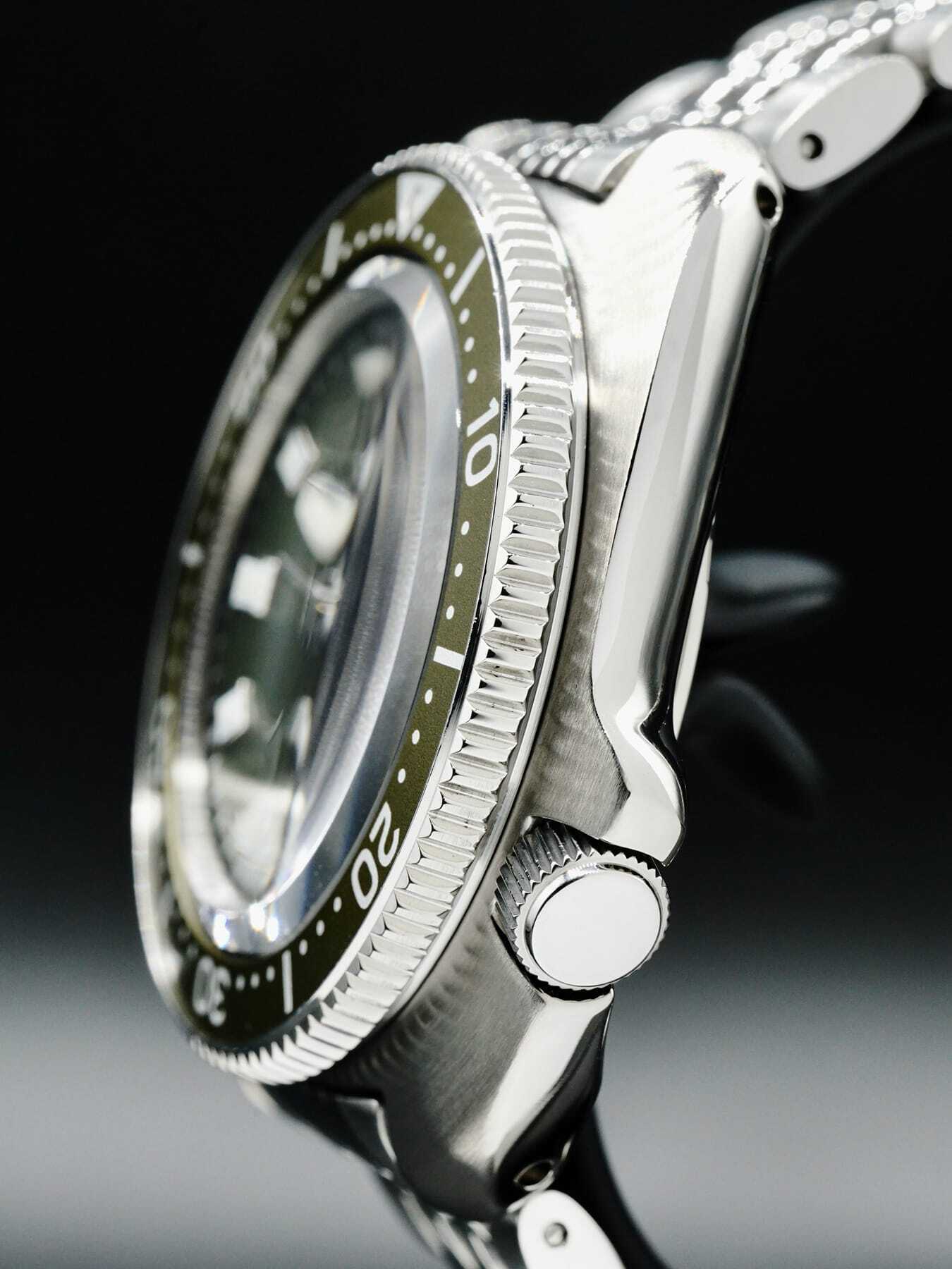 This Seiko Prospex Captain Willard SPB153 features a 42.7mm stainless steel case mounted on a rubber strap. This watch also sports a green dial with luminous hands and indexes.