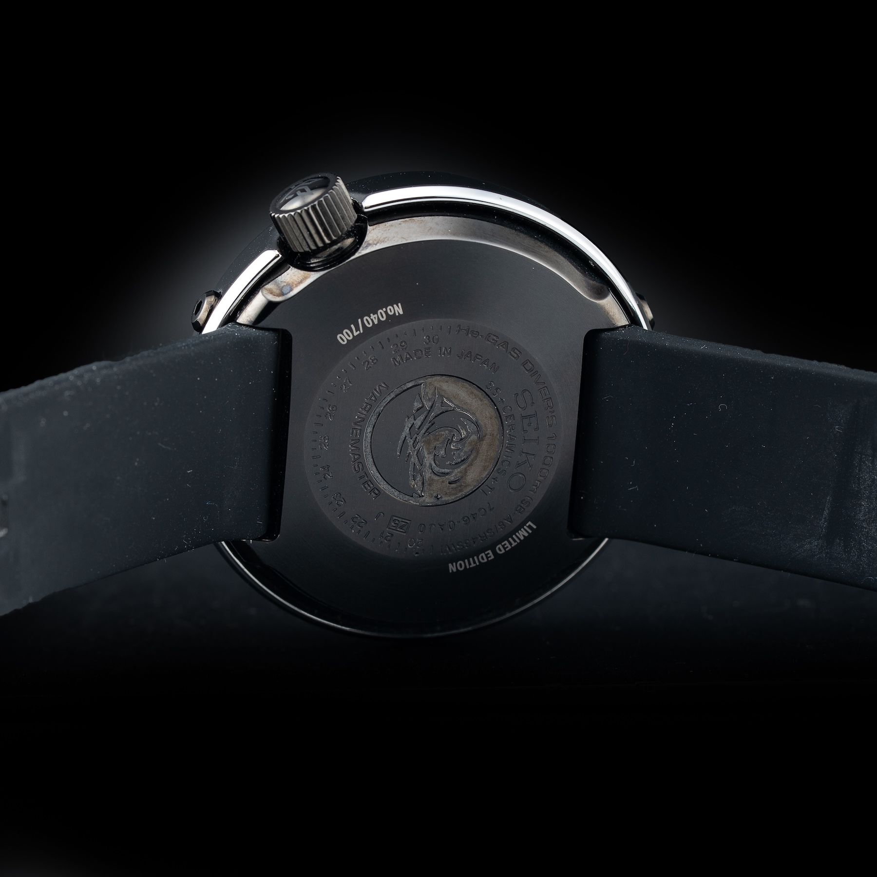 This watch features a 49mm titanium (hard coating) case on silicon strap. This watch also sports a black dial. Powered by a quartz movement. Water resistance up to 1000 meters.