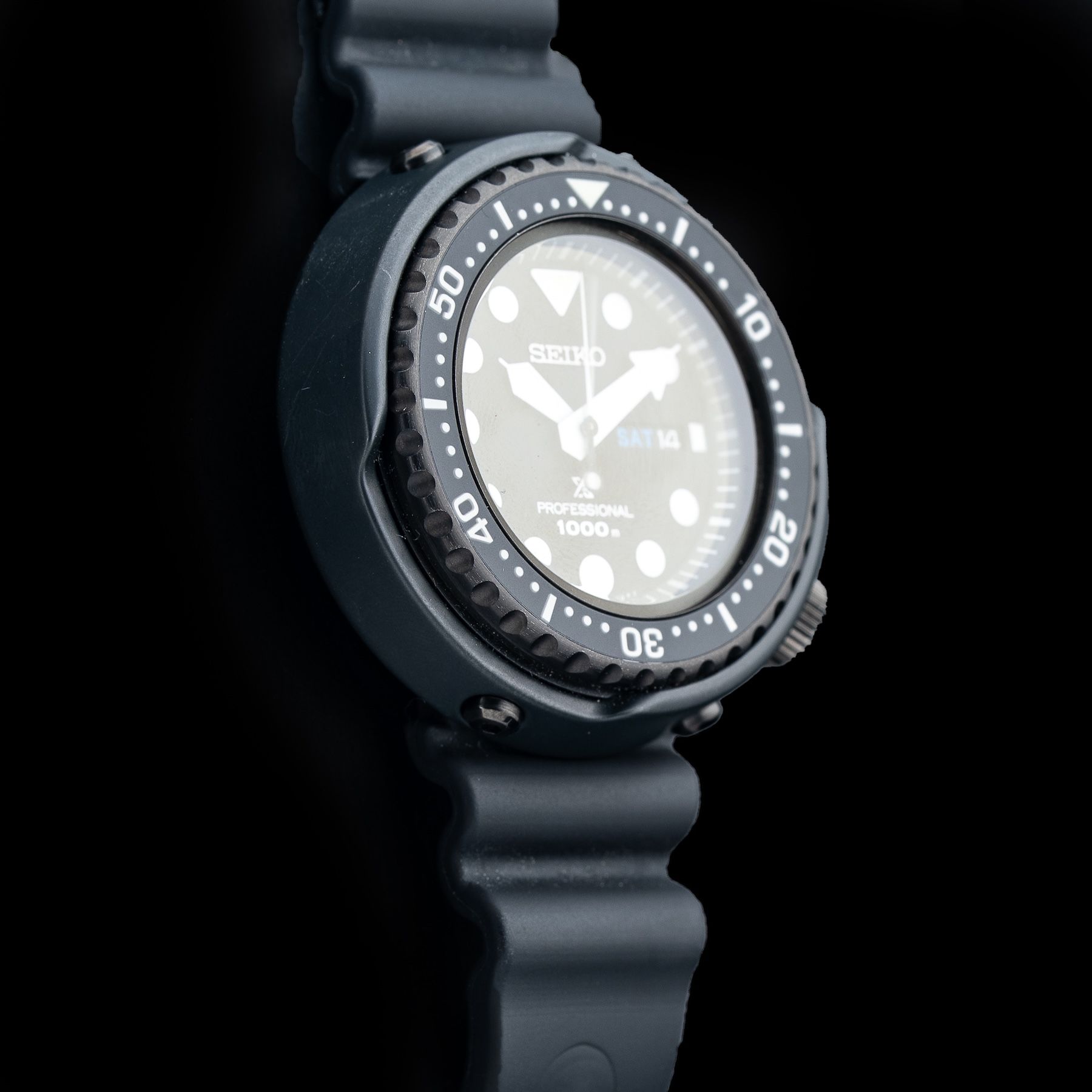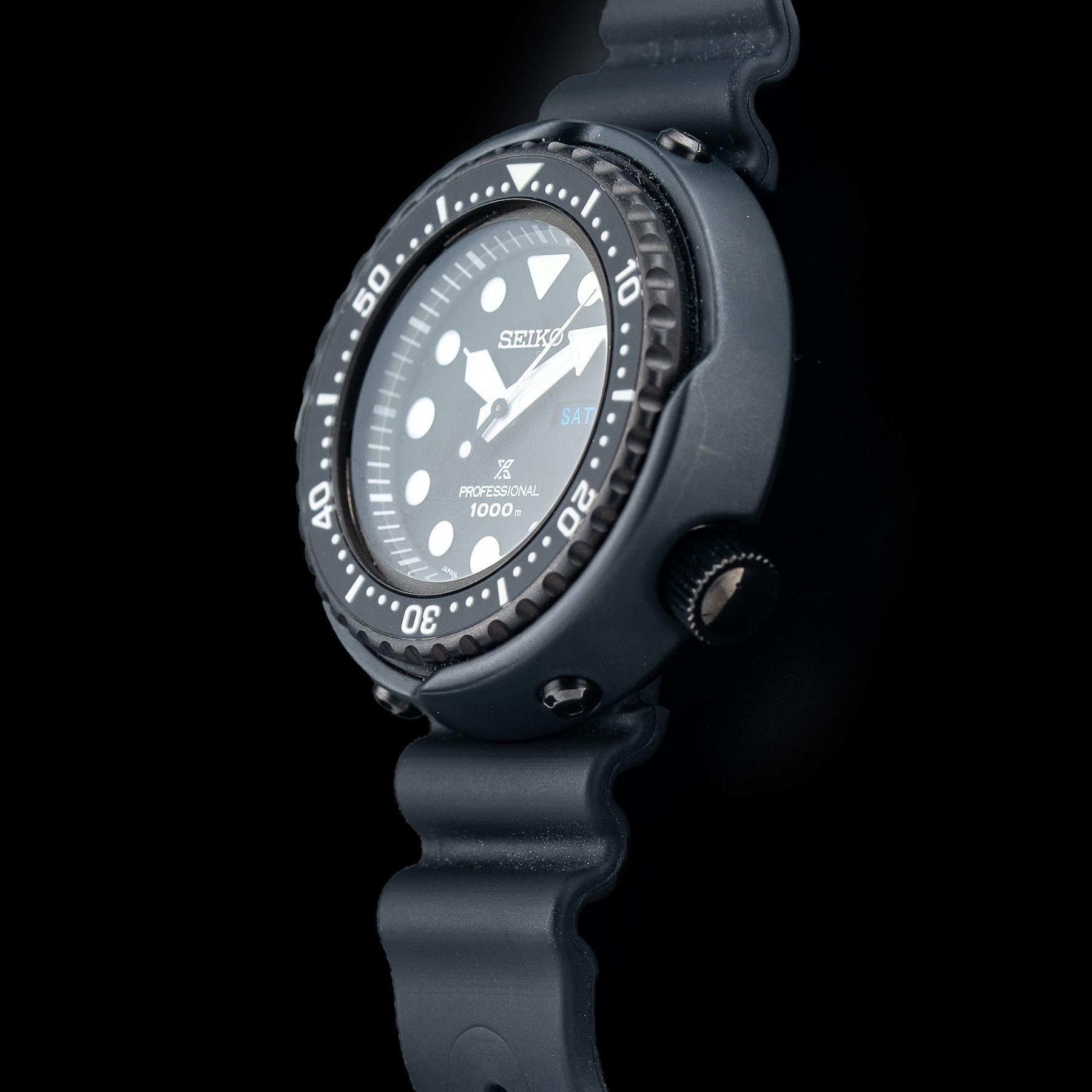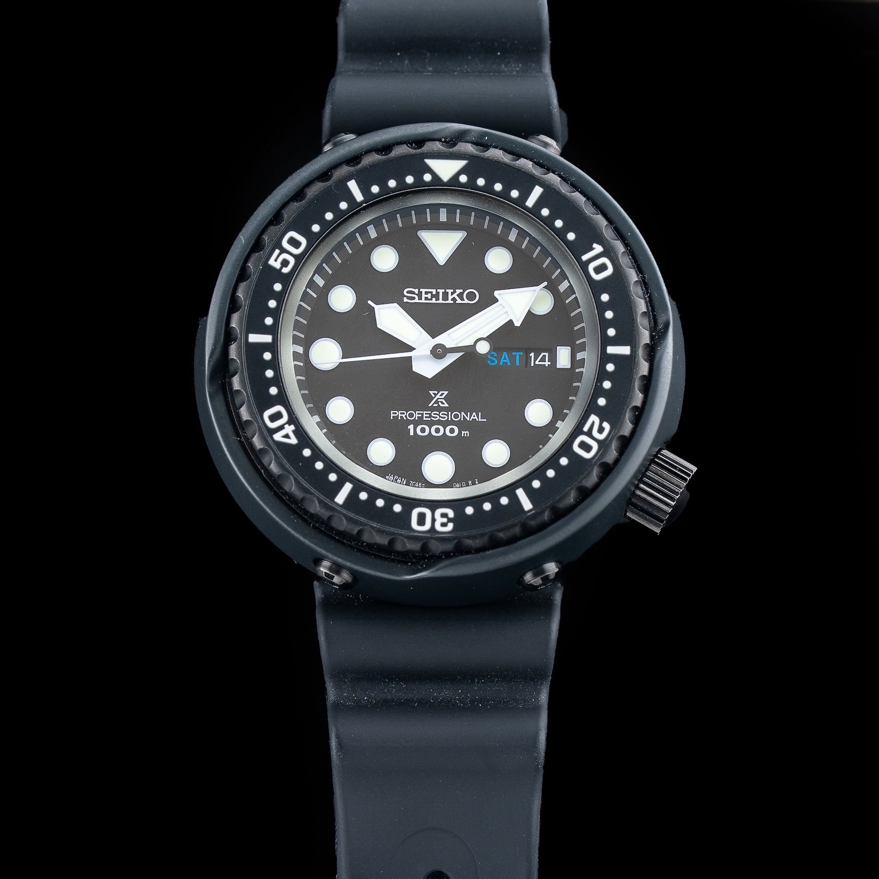 This watch features a 49.37 stainless steel hard coating case on polymer strap. This watch also sports a black dial. Powered by a quartz movement. Water resistance up to 1000 meters.
