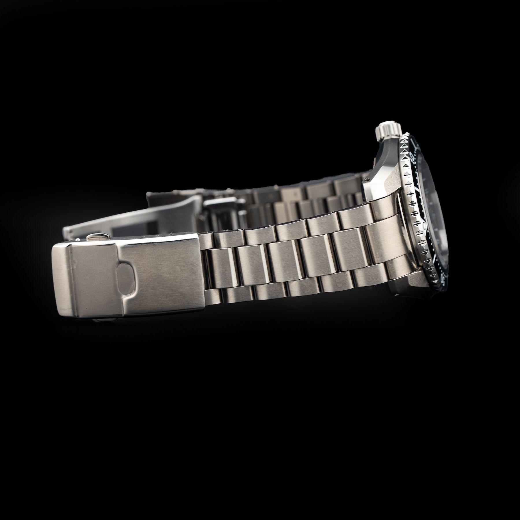 This watch features a 42mm stainless steel case on stainless steel bracelet. This watch also sports a blue dial. Powered by an automatic movement. Water resistance up to 200 meters.