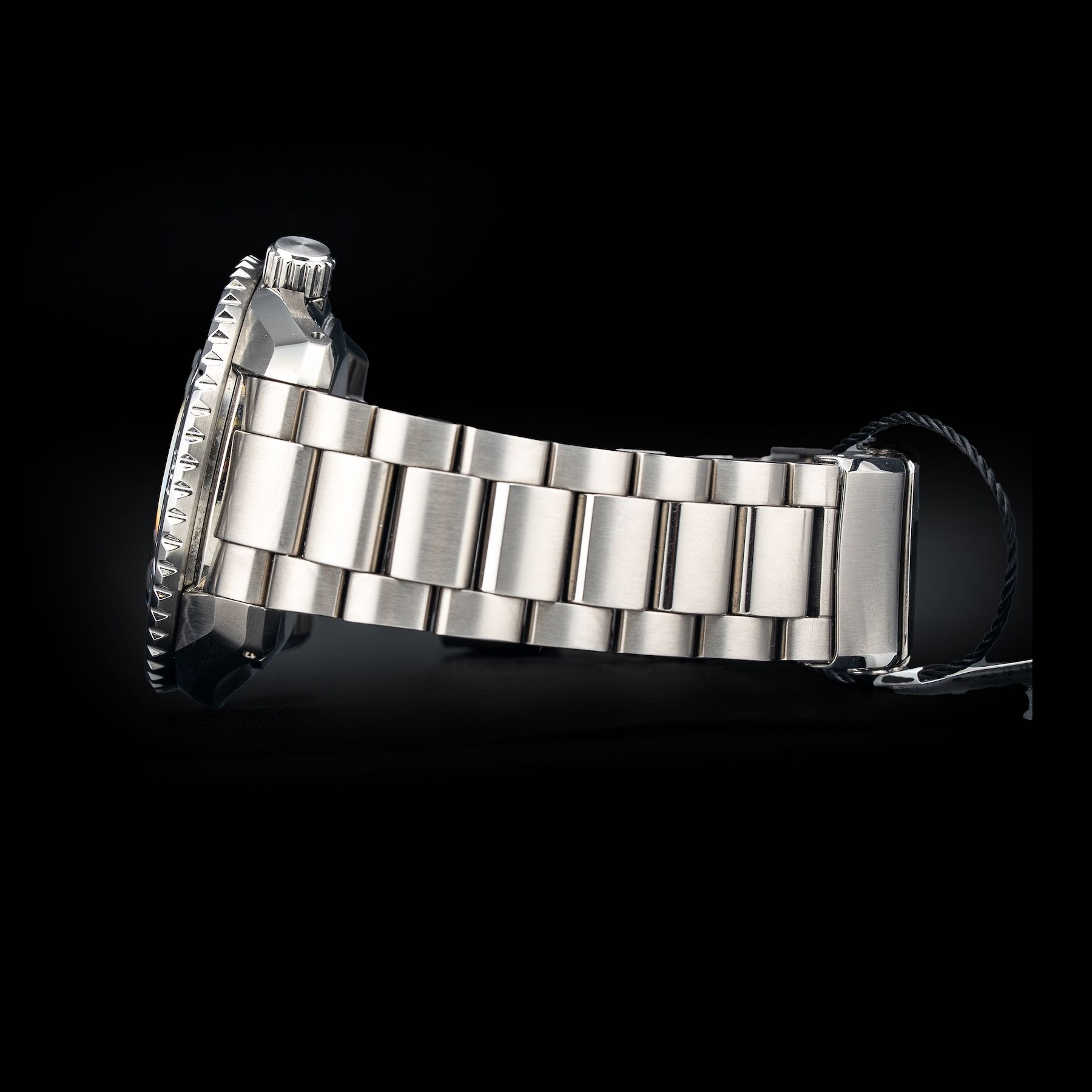 This watch features a 42mm stainless steel case on stainless steel bracelet. This watch also sports a black dial. Powered by a mechanical automatic with manual winding movement. Water resistance up to 200 meters.