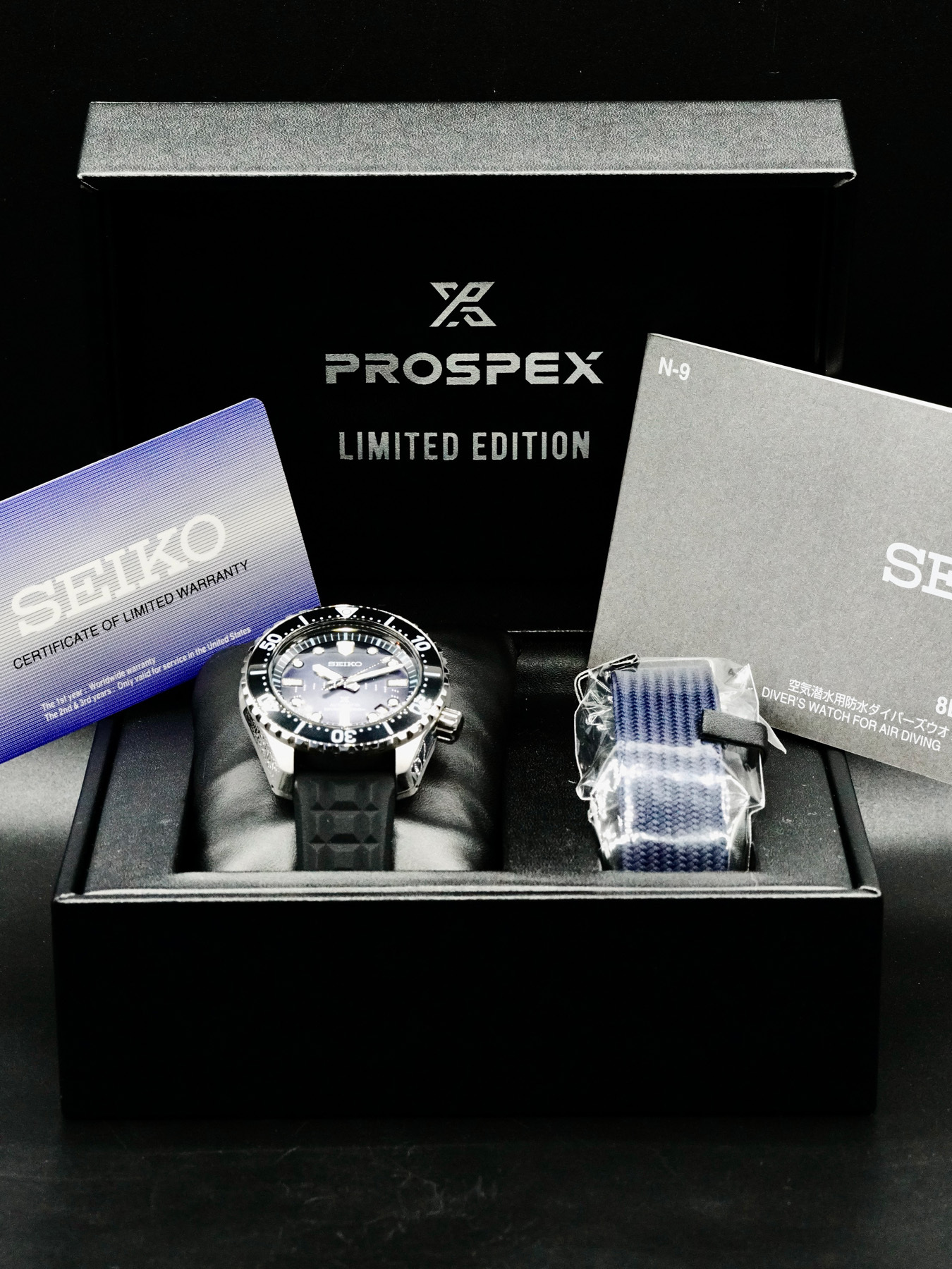 This Seiko Prospex 1968 Diver's Modern Re-interpretation Save the Ocean Limited Edition SLA055 is in EXCELLENT condition. This watch includes its original box, instruction manual, and certificate of limited warranty dated for April 2023. Extra blue textile strap.