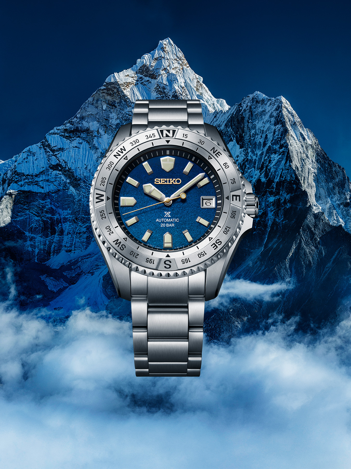 With its adjuster function, wear it over Arctic gear hassle-free. Lumibrite-coated indexes and hands ensure legibility in extreme environments. The sky-blue gradation dial mirrors Mount Everest's view, evoking the universe's majesty.